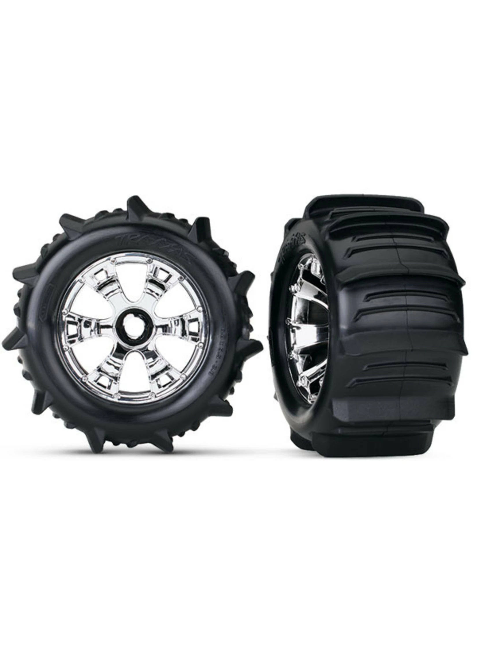Includes: Tires & wheels, assembled, glued (Geode chrome wheels, paddle tires, foam inserts) (2) (TSM rated) (use with 17mm splined wheel hubs & nuts, part # 5353X)