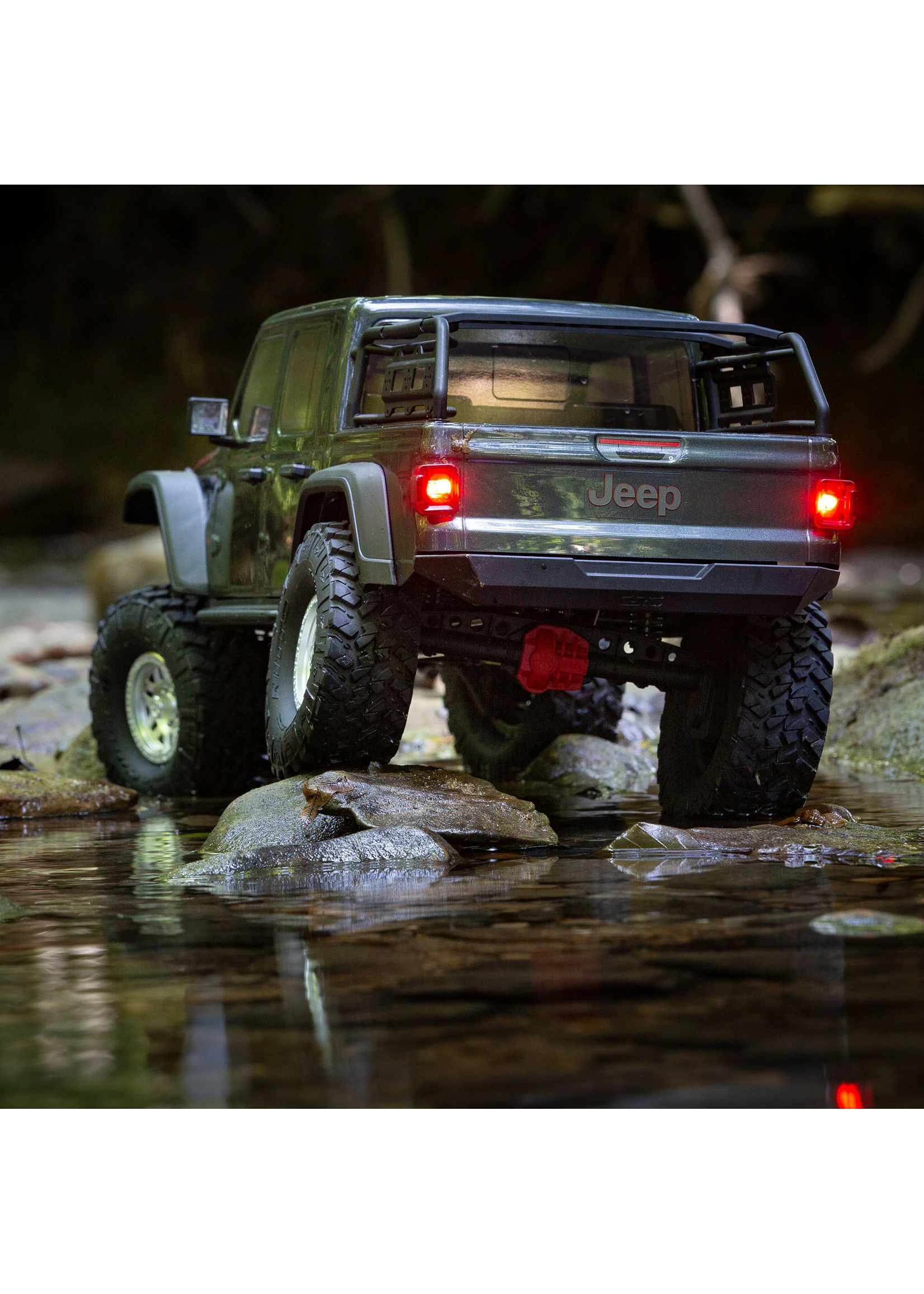 Topping off the chassis is a scale Jeep® JT Gladiator body that mirrors its full-size counterpart with many highly authentic details. The body has over 20 injection-molded parts including a bed rack, door handles, mirrors, hood vents and more — taking polycarbonate body realism to the next level. The body has been split into three pieces for a more realistic deep bed. Officially licensed Nitto Trail Grappler tires on 3-piece beadlock wheels add more scale realism and more grip on dirt, rocks, and all other off-road trails.