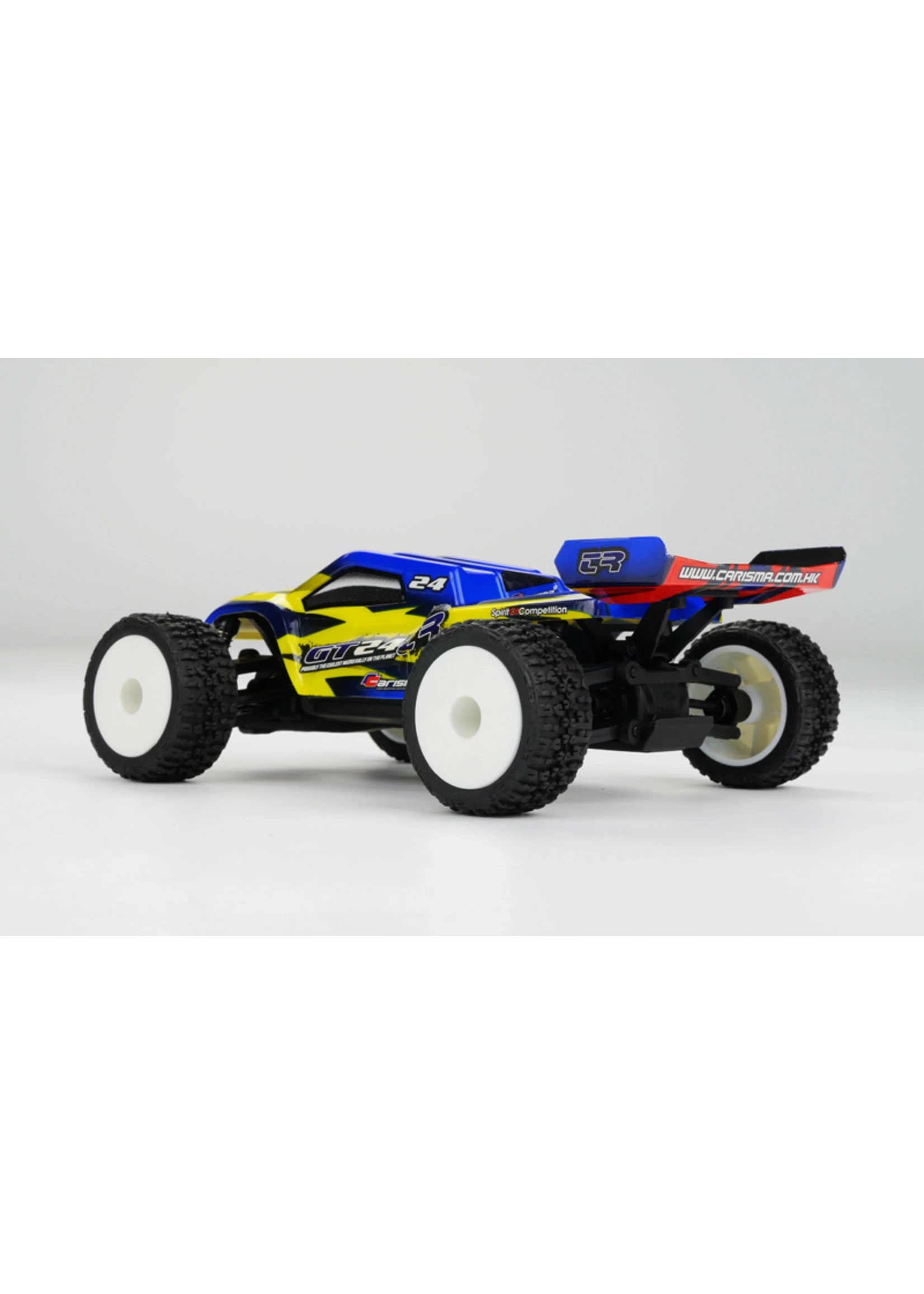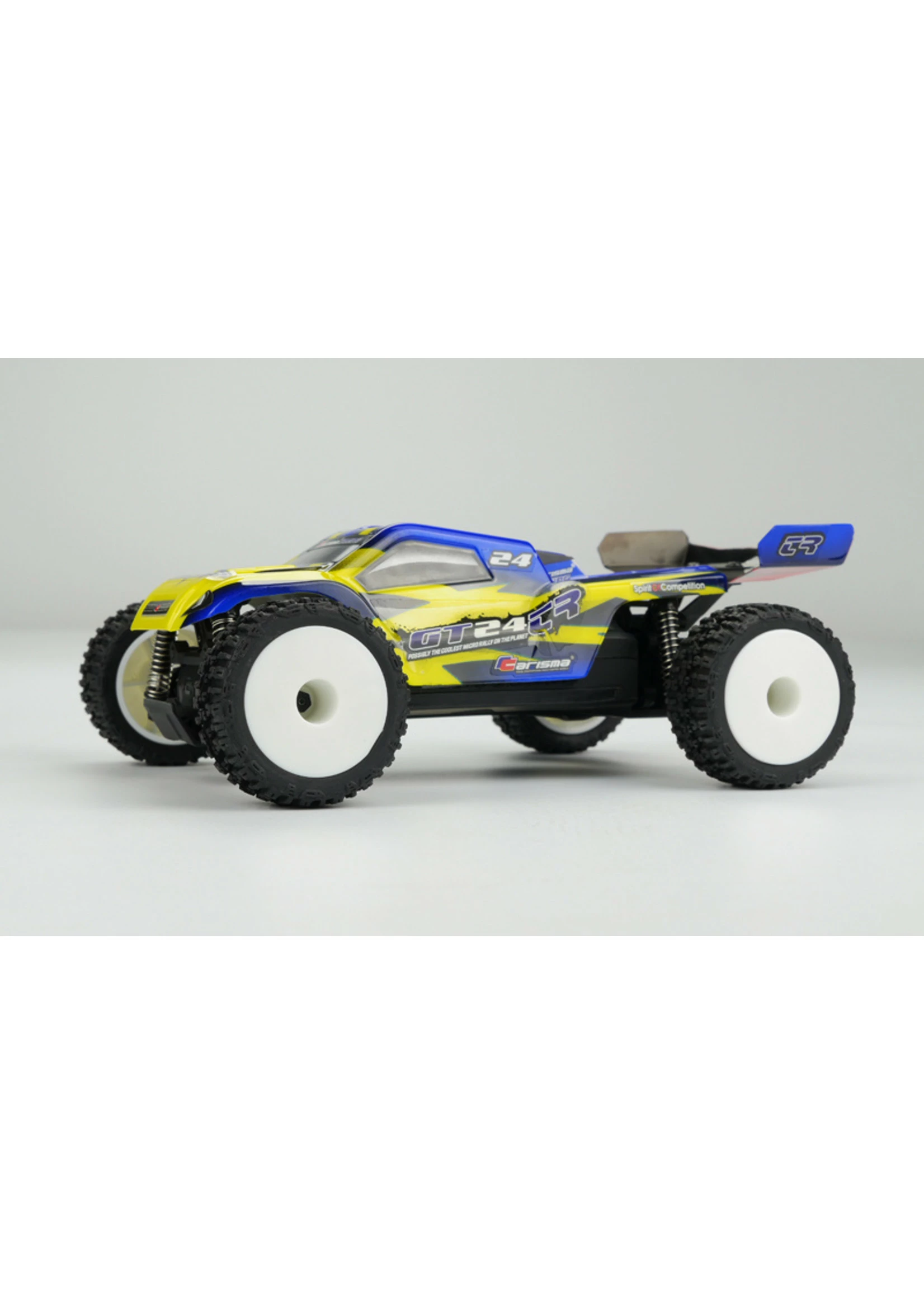 The GT24TR from Carisma takes micro RC tech to an entirely new level of performance, durability, and convenience, and wraps it in a truggy theme. Turn your ping pong table into a race track, or race it on the street or sidewalk. The micro all-terrain racing tires help to transfer the power of the 8000kV brushless motor and 4wd drivetrain, while precision friction dampers keep the suspension plush. Delivering precise control of this micro racing beast is the included CTX8000 2.4GHz transmitter, with an ultra-fast micro servo and brushless ESC with reverse. The chassis comes complete with full ball bearings, gear differentials, center slipper, and colorful screen-printed body with high-downforce wing.