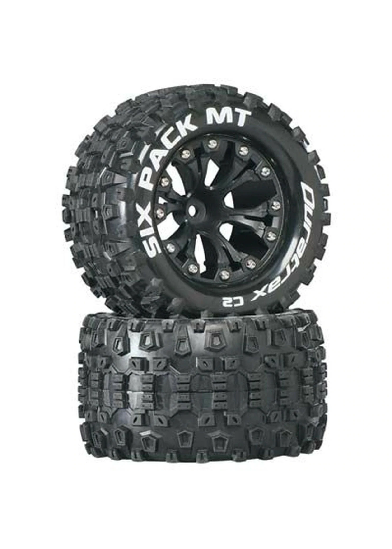2 – DuraTrax Sixpack MT 1/10 scale 2.8” Mounted Monster Truck Tires with Black Wheels and Foam Inserts, 1/2 Offset.