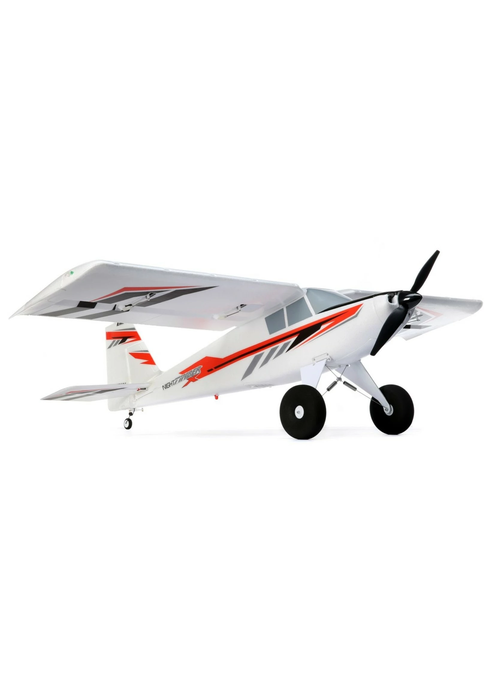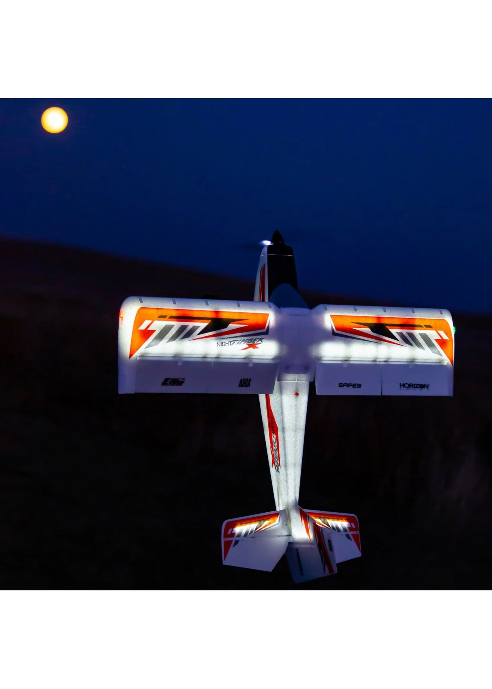The E-flite® Timber® X 1.2m combined the STOL capabilities of the original Timber 1.5m model with a wing design featuring oversized ailerons and flaps, plus an enlarged rudder and elevator and a more powerful 3S and 4S compatible power system, to also deliver 3D performance you’d expect from an all-out aerobat. Now the Night Timber® X 1.2m adds factory-installed, high-visibility LED lights throughout the airframe for flying all day AND all night! It’s also equipped with a 60-amp Spektrum™ Avian™ Smart ESC, and the BNF® Basic version is equipped with an AR637TA receiver that offers full-range telemetry including real-time battery voltage, current, temperature and more – along with motor reversing for special ground handling and other capabilities – when using compatible transmitters.