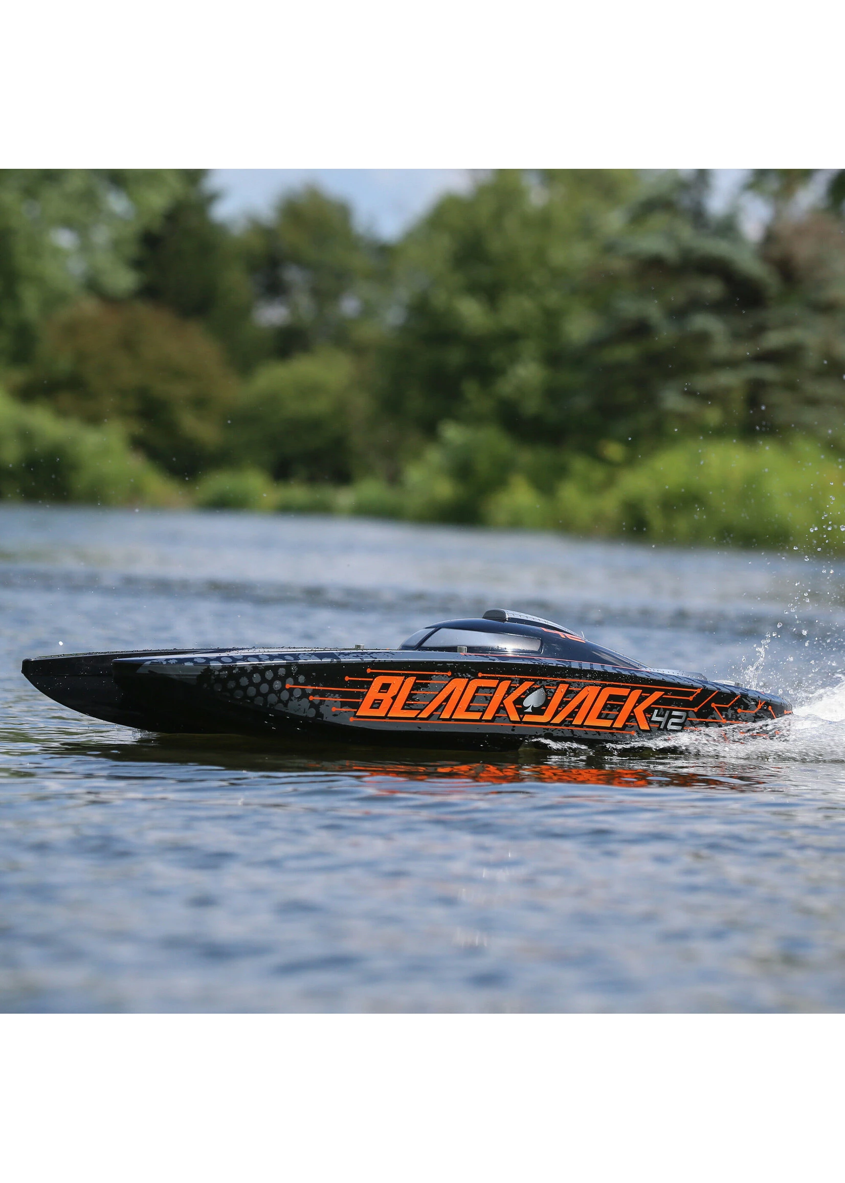 The Pro Boat® Blackjackâ„¢ 42 Brushless 8S Catamaran returns you to the days of large-scale racing taking on all comers with style and speed. Now featuring Spektrumâ„¢ Smart, there’s no other boat in this size, with this much power, at such an affordable value.Â