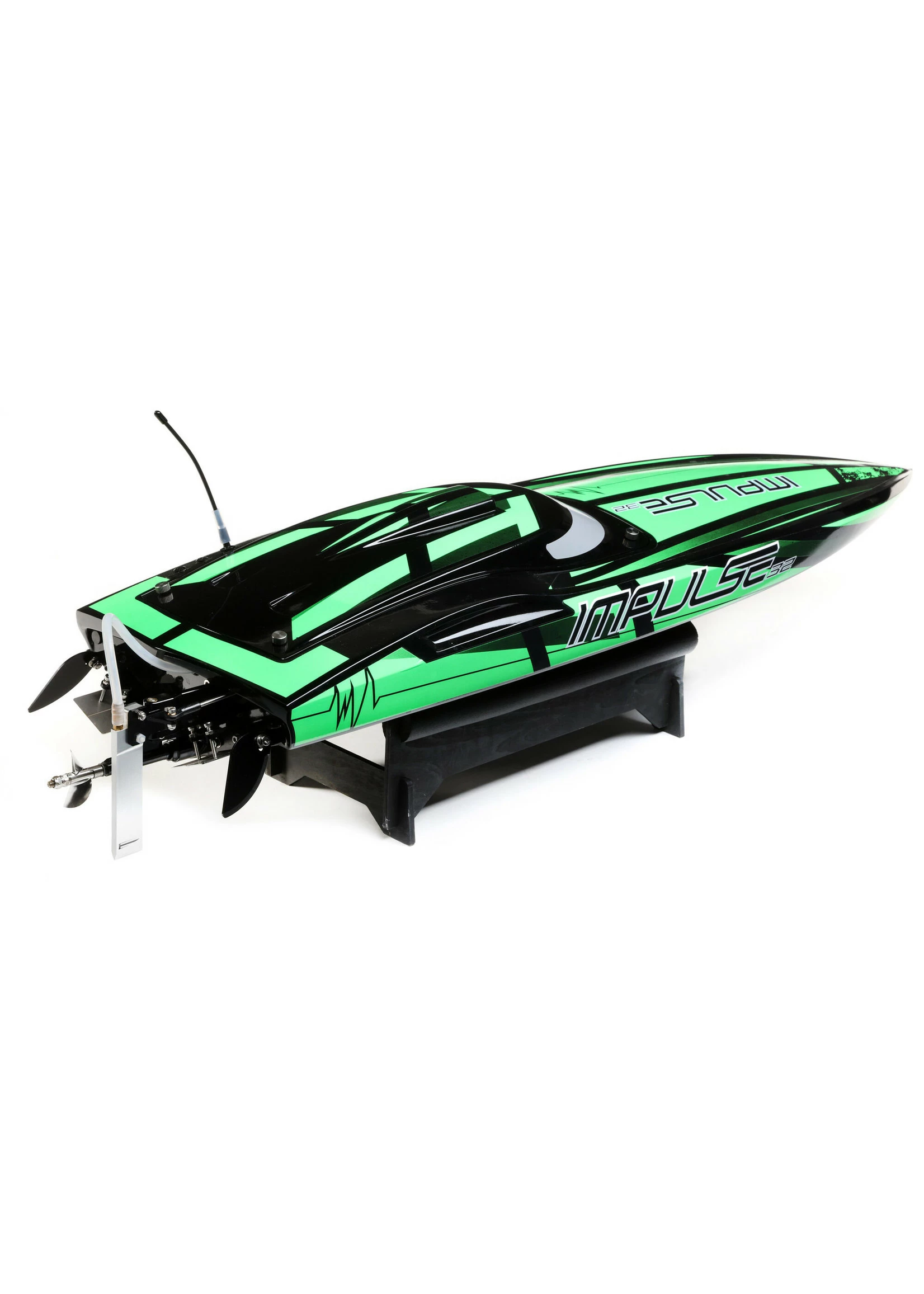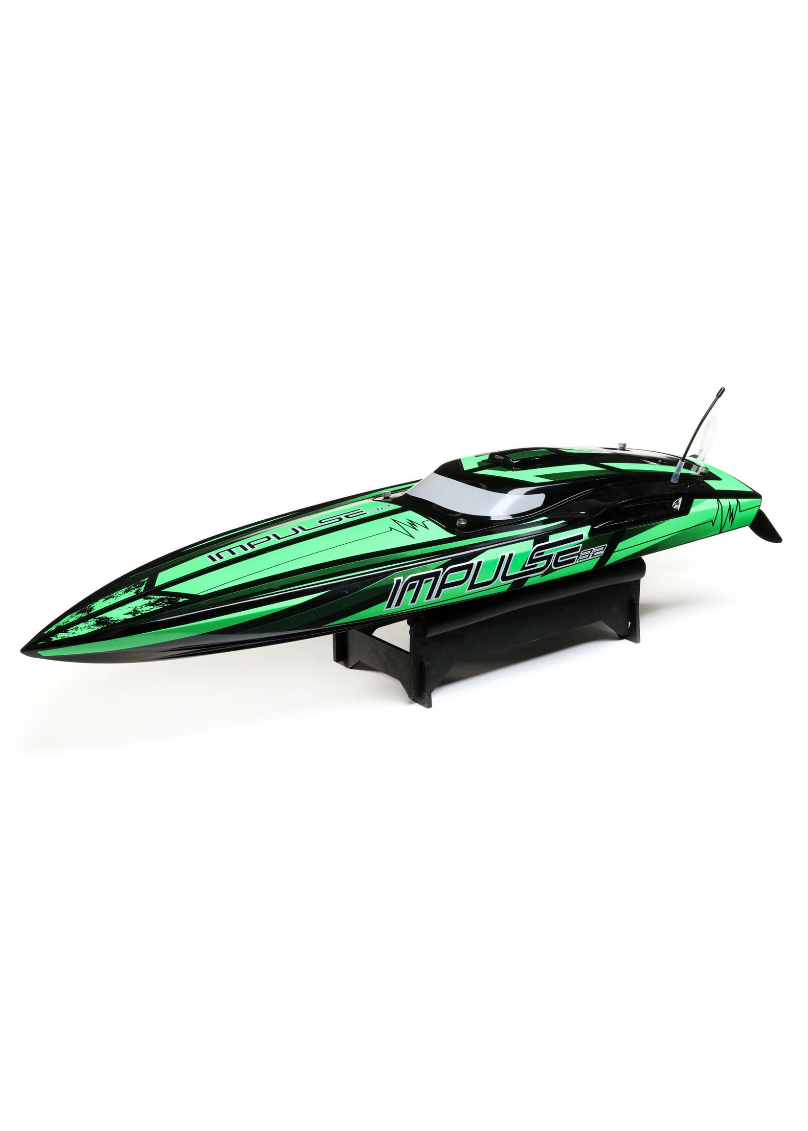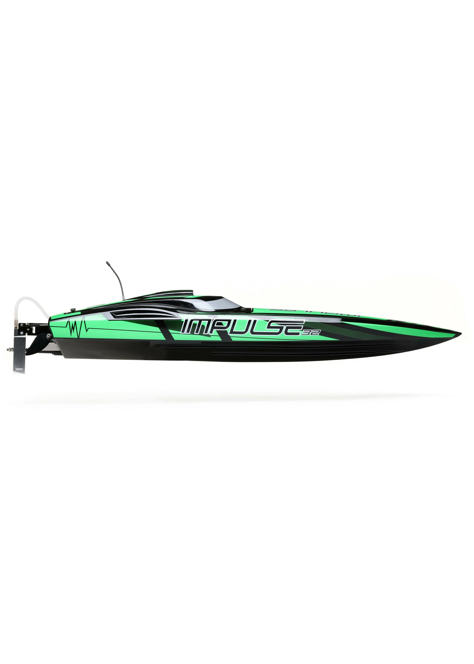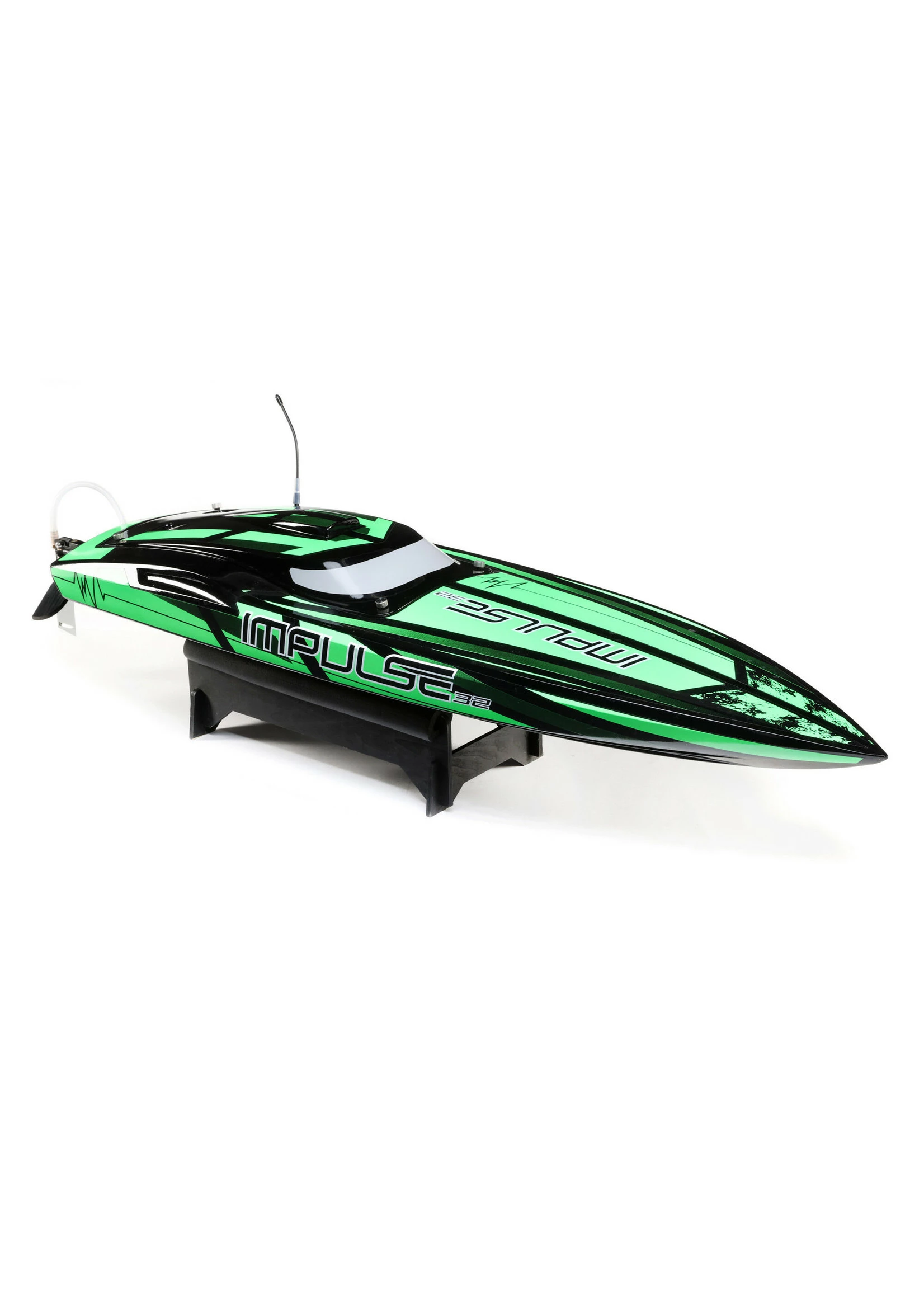 The Pro Boat® Impulse 32-inch Brushless V-Hull picks up where the Impulse 31 left off and brings tremendous excitement with new styling unlike any other V-hull RC boat on the market. The Spektrum™ 2000Kv water-cooled motor coupled with the high-powered Spektrum Firma™ 160A water-cooled Smart ESC is capable of producing up to 3 horsepower and hitting 55+ MPH! Of course, everything is controlled by the Spektrum Smart System making this speed demon incredibly intelligent. A Spektrum DX3 Transmitter and waterproof SR315 Dual Protocol 3-channel Telemetry Receiver keep everything tightly connected for interference free operation and built-in telemetry. With Smart, users can see battery voltage (tank level) (DX3 Standard just views Battery Level), ESC Temps, Amp Draw, and motor RPM (with either a Blue Tooth Module and Dashboard App, or utilizing a DX5 etc.). The Impulse 32 also features a multi-layer fiberglass hull and canopy with aluminum thumb screw canopy locks, a durable composite molded interior, an aluminum rudder, and stainless-steel propeller. With the latest technological advances and powerful motor, the lake is yours with the Pro Boat Impulse 32-inch V Hull.