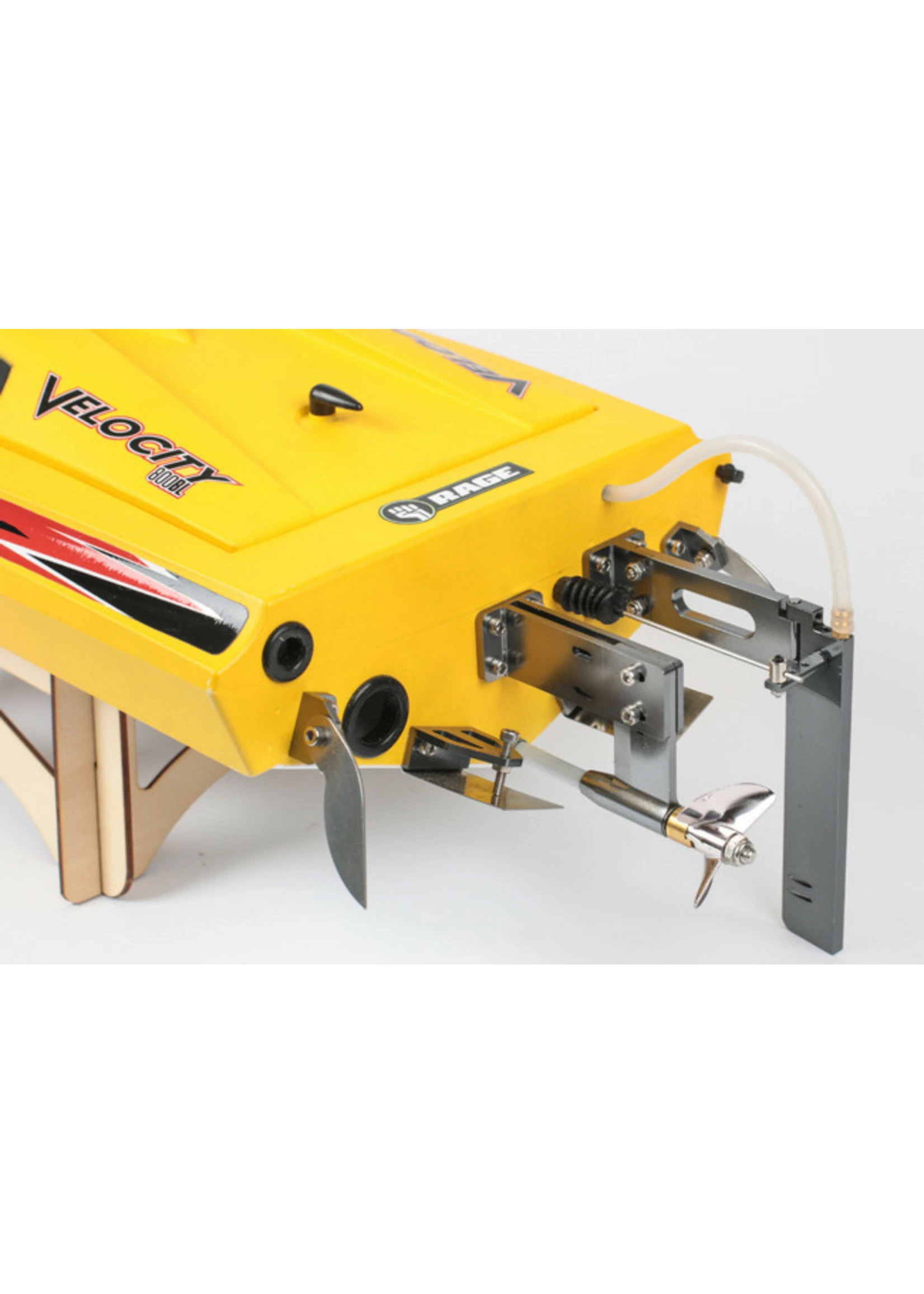 The Velocity 800BL is propelled by brushless power that will have you flying across the water at adrenaline-pumping speeds of over 45MPH! Performance is delivered by a brushless, water-cooled 1750kV motor, and harnessed by a 60A water-cooled electronic speed control. This offshore rocket ship features a durable uni-body ABS hull that arrives pre-painted with a unique matte yellow finish and bright, bold graphics that combine to give the Velocity a fast, aggressive appearance. The durable zinc/aluminum alloy propeller, anodized aluminum rudder, and stainless running hardware provide a rugged, yet elegant look that completes the package, making the Velocity 800 BL a great looking, high-performance boat that looks as fast on the included display stand as it does on the water. Should high speeds, aggressive turns, or rough seas cause the boat to flip or capsize, the unique self-righting feature automatically turns the boat right-side-up within a few seconds, allowing the driver to bring the Velocity back to dock safely.