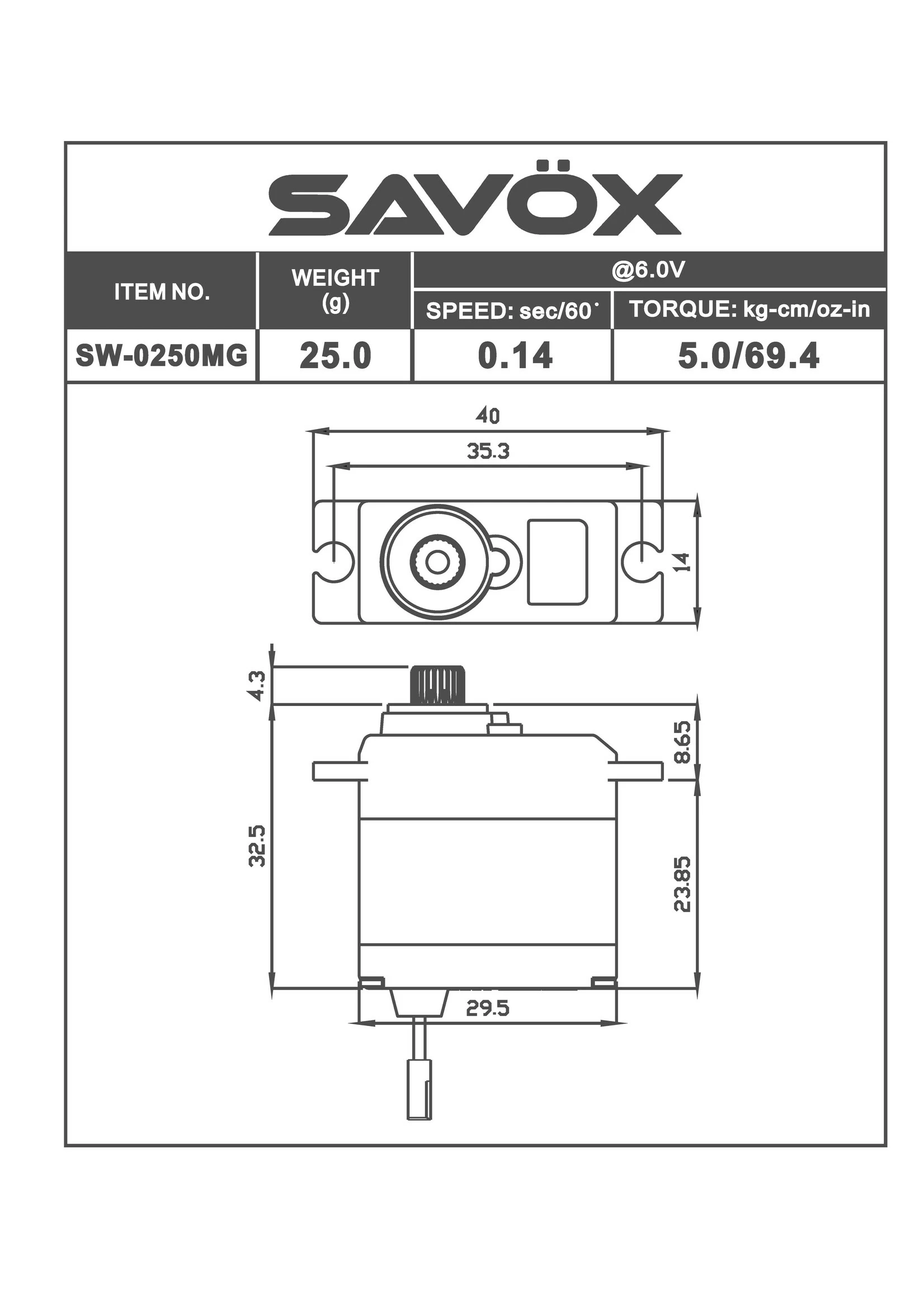 - Torque @ 4.8v – 3.5kg/48.6oz-in