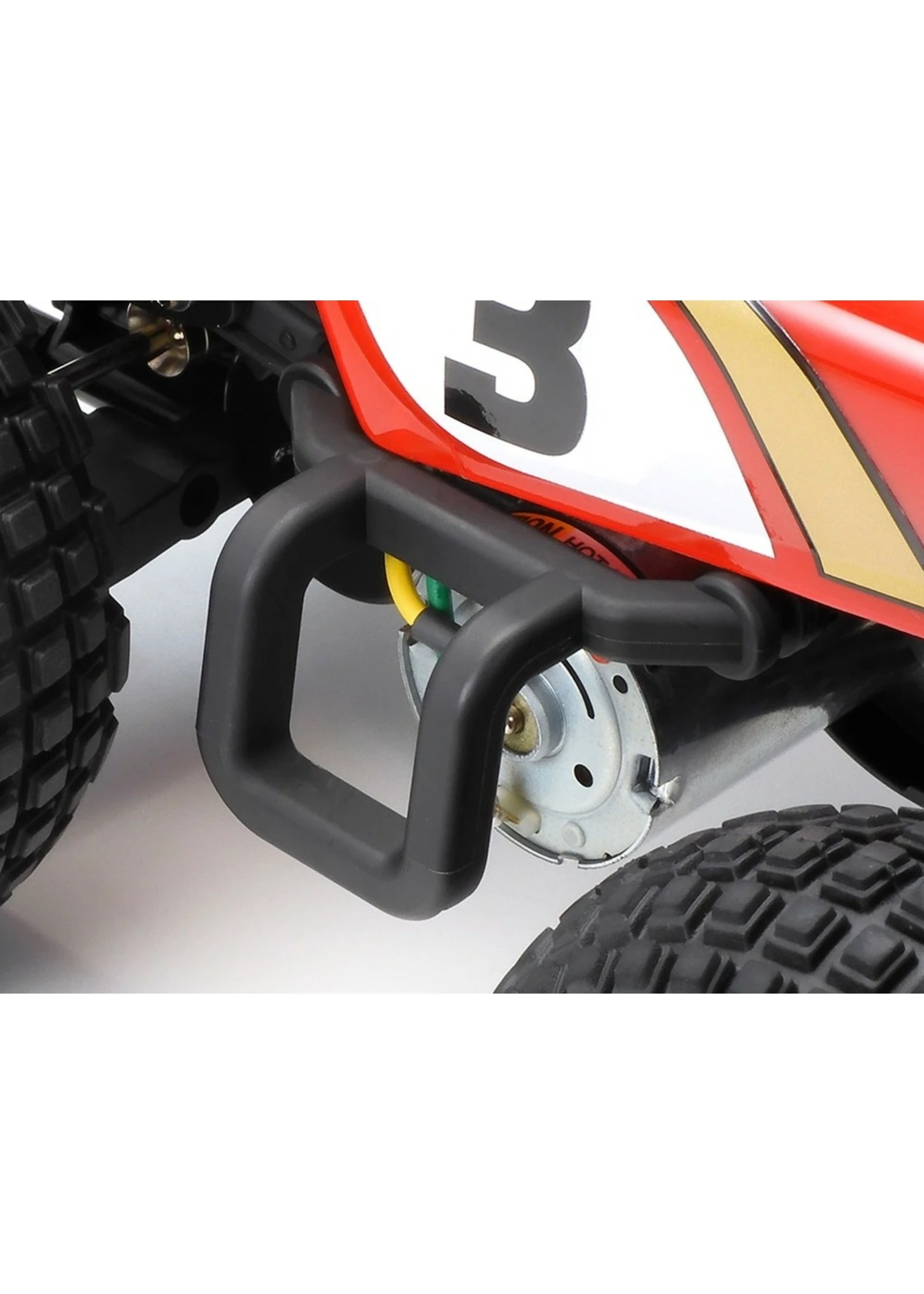 This R/C model assembly kit creates a 4WD buggy, with a lightweight and durable stylized polycarbonate version of the legendary Hot Shot body. The reimagined comical body comes pre-painted in red and all that is needed is the application of the included stickers, and voila! A new, Comical Hot Shot which pays homage to Tamiya’s classic 1985 Hot Shot kit! The GF-01CB chassis in which the body sits on top of is a gear-driven unit that provides a thrilling drive and super wheelies when you jam on the throttle.