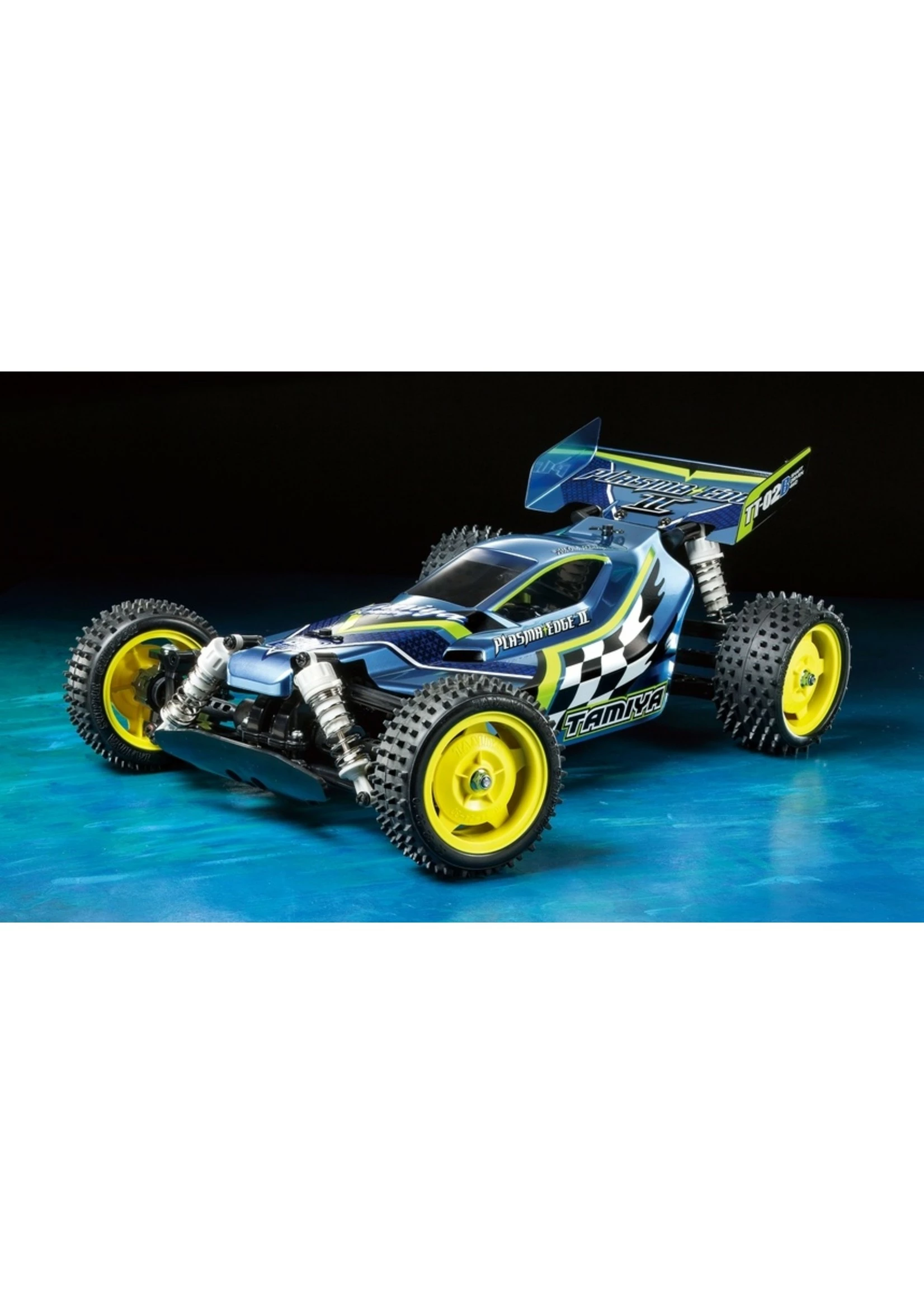 This exciting shaft-driven 4WD R/C buggy assembly kit creates the Plasma Edge II, and includes stylish polycarbonate body and rear wing parts. Marking stickers add to the racy mood of the model, as do fluorescent yellow star dish wheels and white CVA oil shocks. The TT-02B is a dedicated off-road buggy chassis that offers hassle-free assembly and maintenance, as well as superb controllability.
