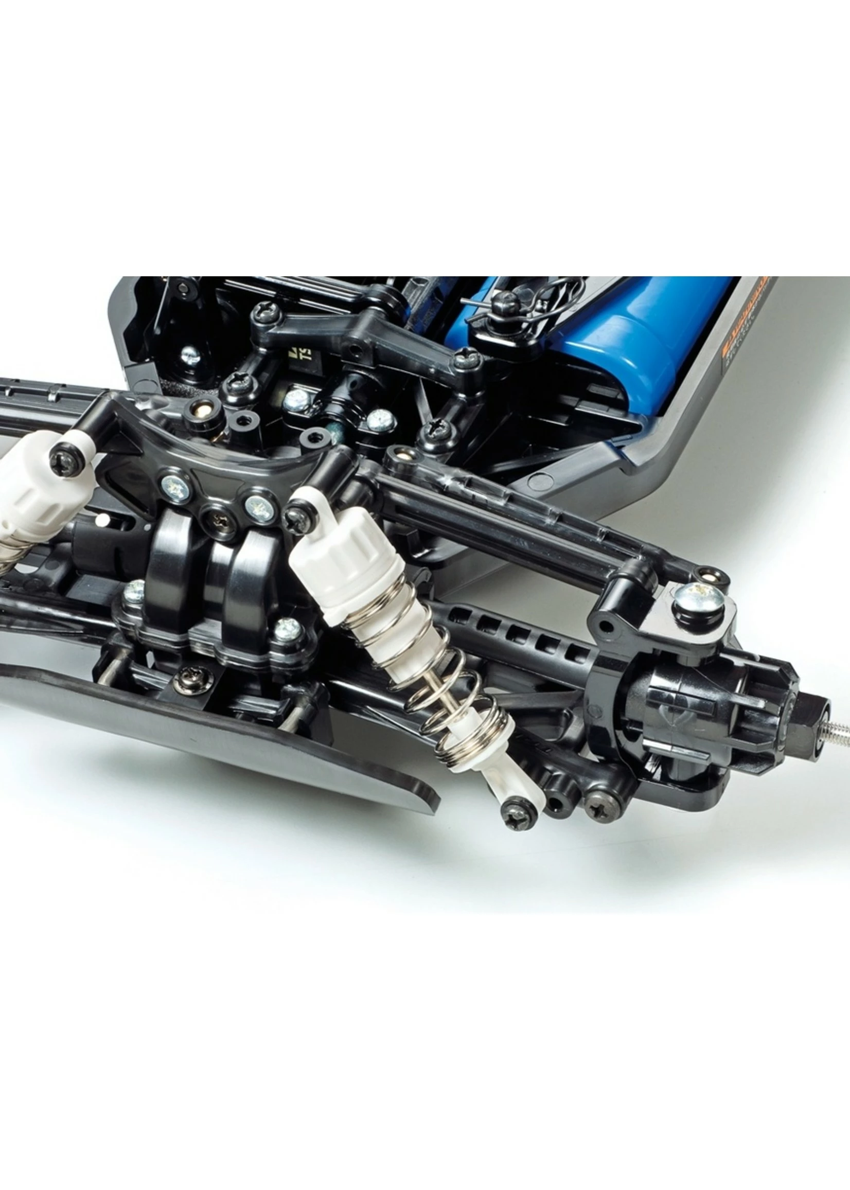 - 4-wheel double wishbone suspension features long arms and white color CVA shock units, and is combined with high-grip square spike tires to give excellent traction.