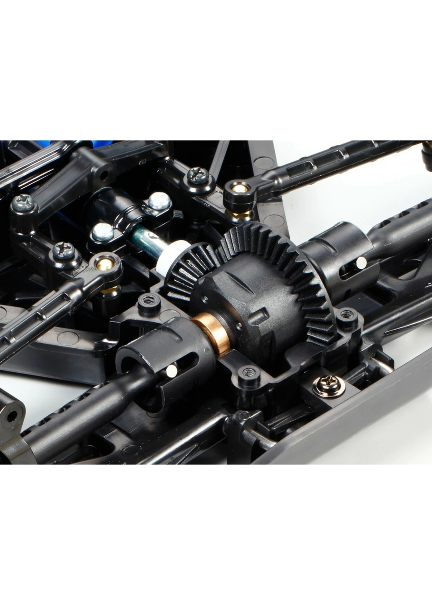 The shaft-driven 4WD TT-02B buggy chassis employs a skid-shaped frame. Its suspension setup uses 4-wheel independent double wishbone suspension with long arms, plus white CVA oil shock units, giving the car assured handling, while left/right suspension arms and uprights are identical to facilitate hassle-free assembly. Front/rear gearboxes include 4-bevel differentials for smooth operation, and are sealed to ensure that dust can’t get inside. The top can be removed simply by loosening a few screws, making maintenance a breeze. 4 different gear ratios can be applied with the use of 3 separately-sold types of pinion gear, allowing you to match the characteristics of your car setup to the conditions at any given time. Of course, this off-road chassis also includes receiver case and motor cover to protect them from dirt and debris thrown up off of the track.