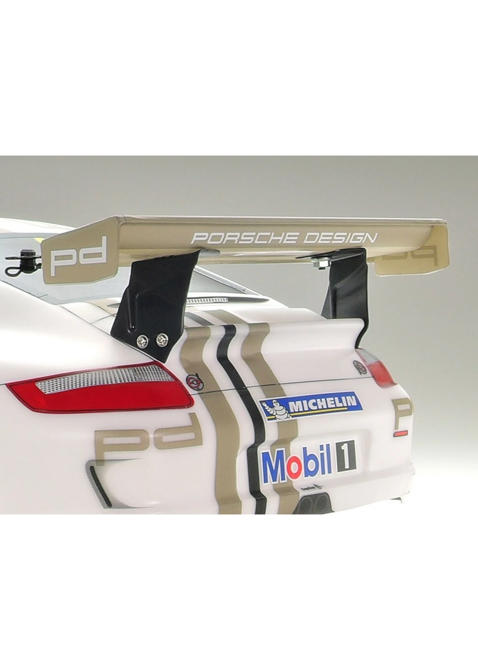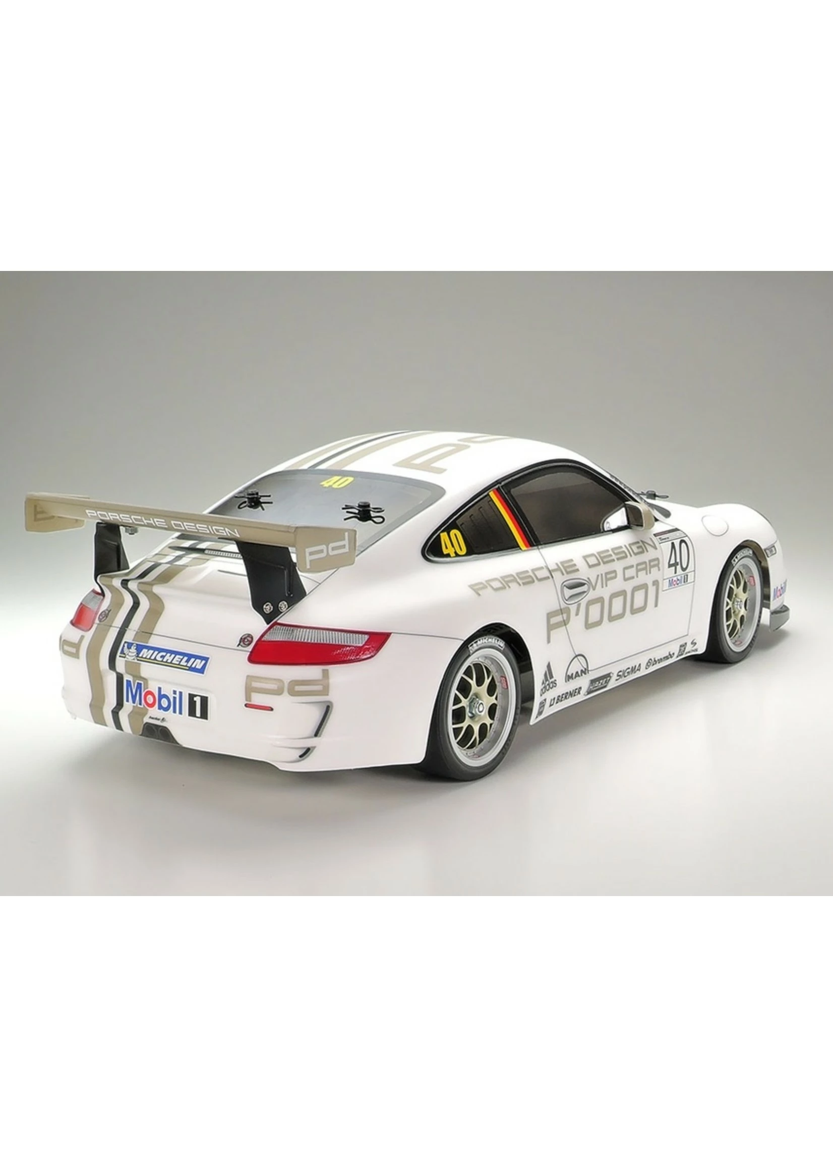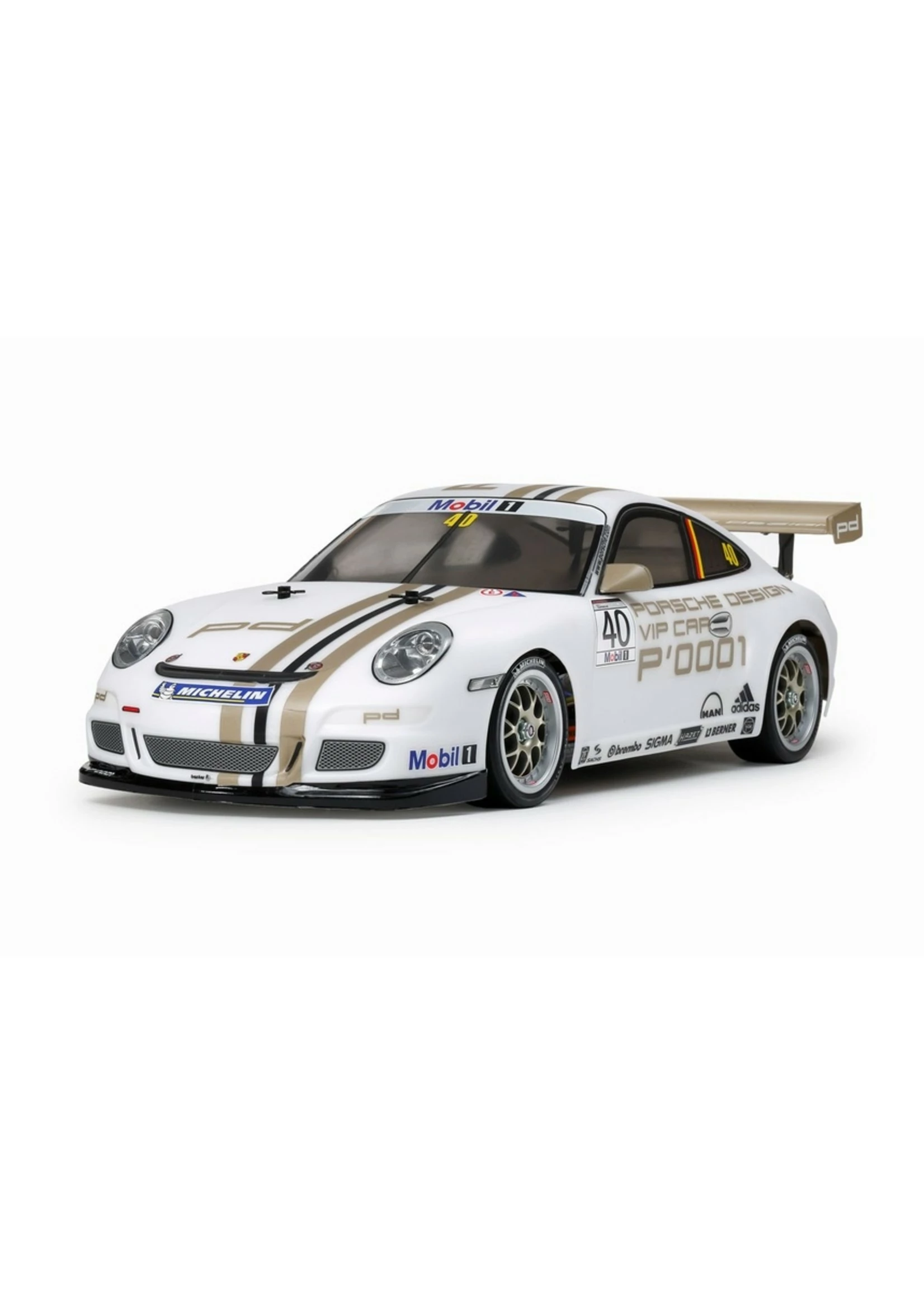 This Tamiya R/C kit faithfully recreates the Porsche 911 GT3 CUP VIP customer race car. The 911 GT3 Cup car was developed for the Porsche Super Cup, a single-make racing series gracing circuits around the world. The VIP car recreated by this assembly kit was run by Porsche themselves and was driven upon invitation by a different driver according to the race. Its powerful form and rear wing are recreated expertly in durable and lightweight polycarbonate, with separately molded side mirror parts, plus metal-plated light cases that allow the installation of separately sold LEDs front and rear. Stickers are included in the kit to recreate numerous sponsor logos and other markings.