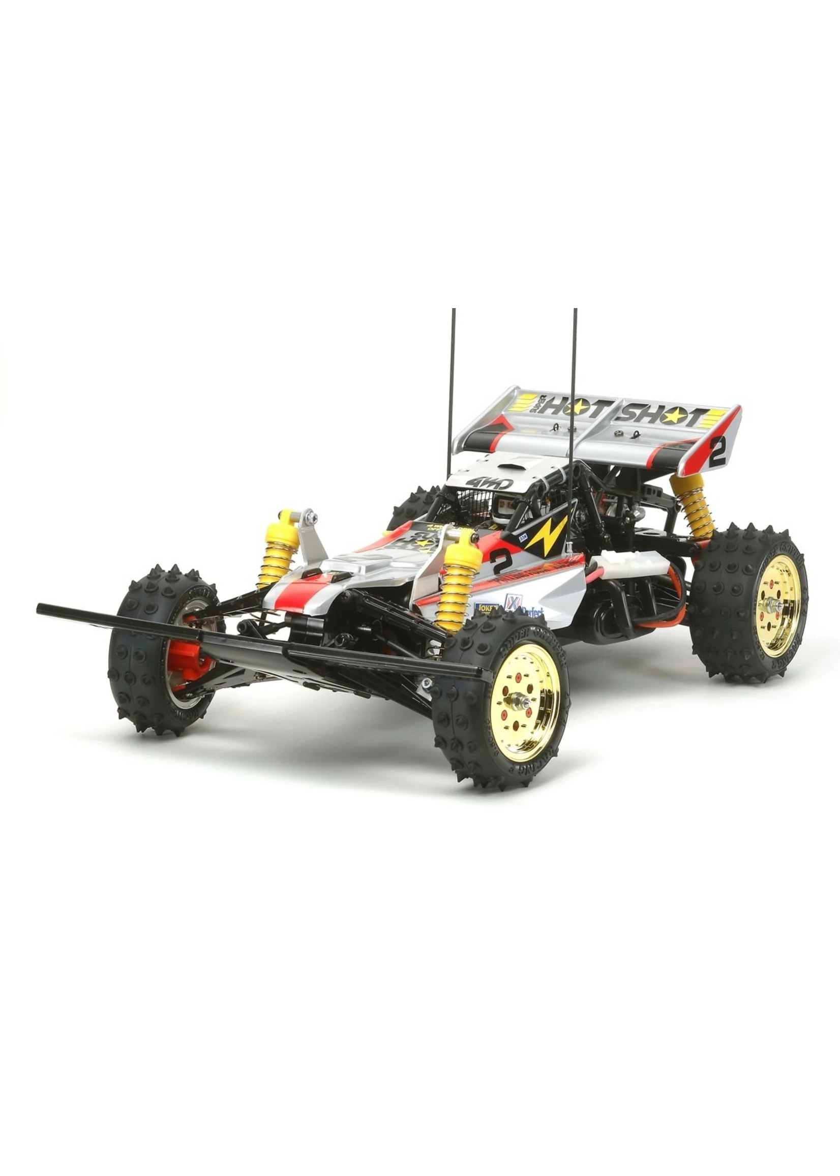 Tamiya originally released a special version of the R/C 4WD racing buggy Hotshot in 1986. This famous machine is set for a return as the Super Hotshot and features modern improvements while keeping the basic layout of the original. Distinctive external features such as the stylish silver body and rear wing, yellow oil dampers, and spiked tires with gold metal-plated wheels have also been kept.