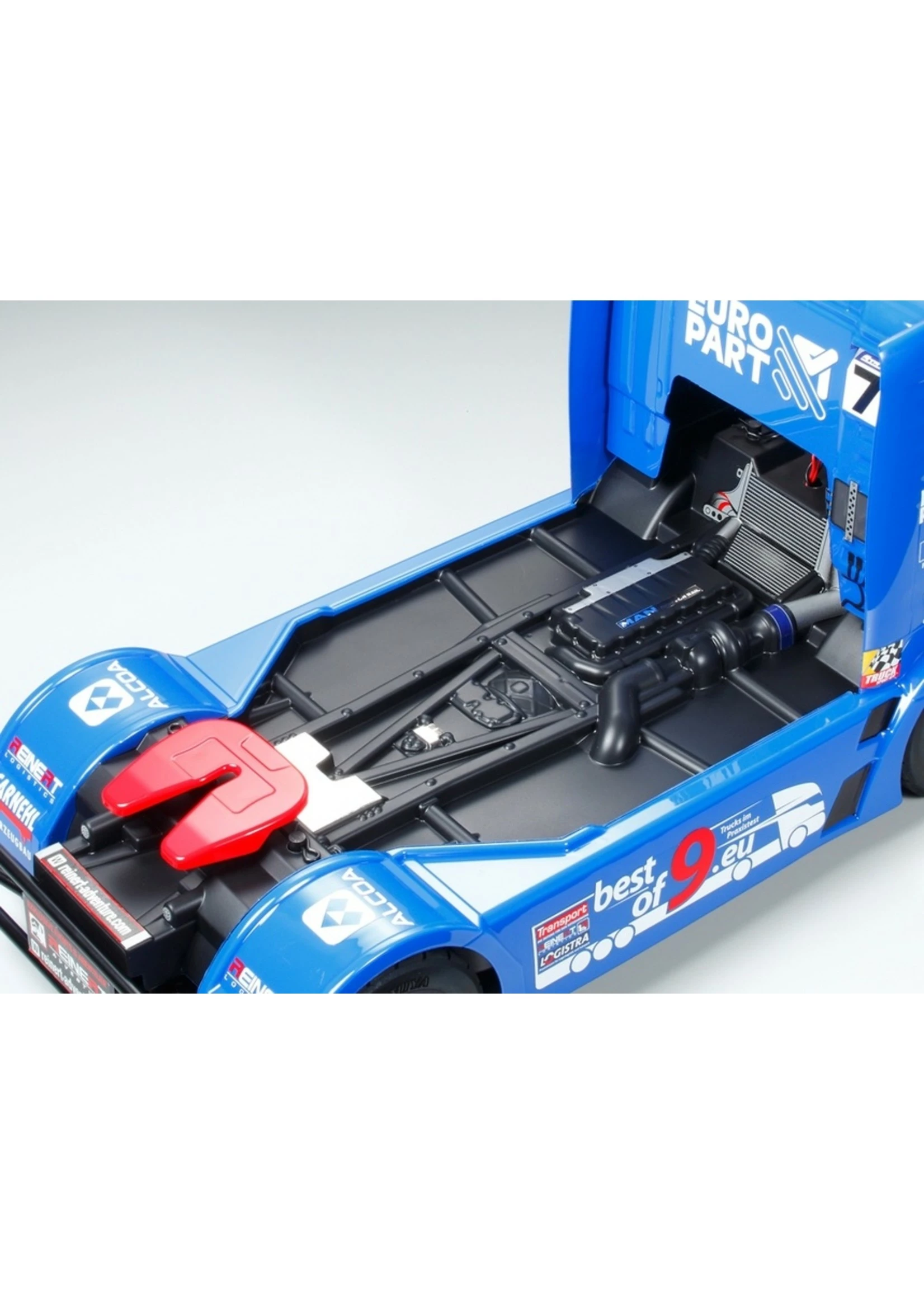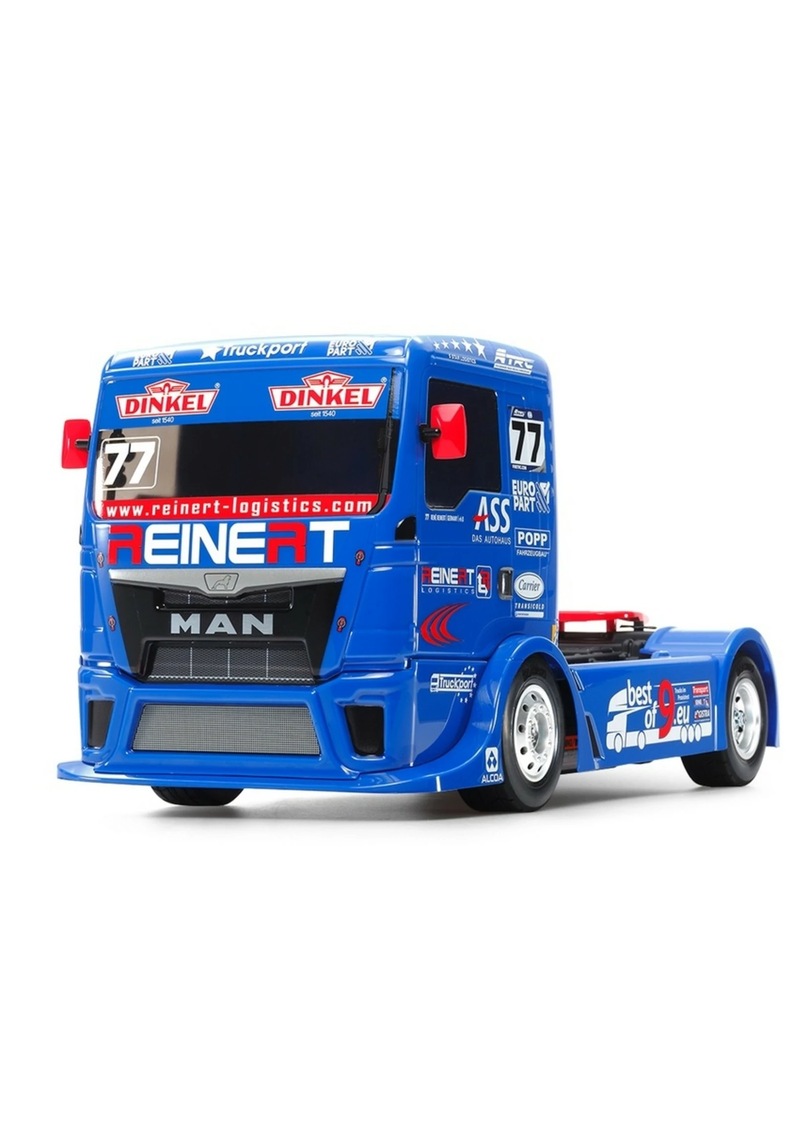 This is an exciting R/C model assembly kit recreating the Team REINERT Racing MAN TGS truck which starred on the 2016 European truck racing circuit. The realistic body is a 4-piece set made from lightweight and durable polycarbonate, with separately molded plastic side mirrors, coupler and rear bumper parts. Stickers are included in the kit to recreate the truck’s numerous sponsor markings and logos, etc. The TT-01 Type-E chassis is a proven performer, and here is fitted with dedicated racing truck model wheels and tires.