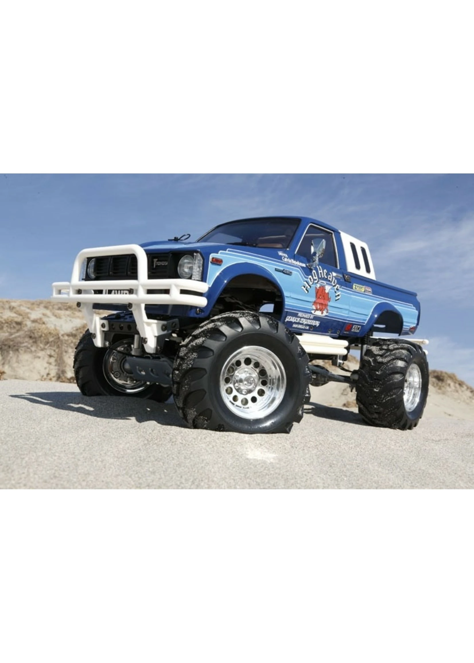 This electric R/C assembly kit reproduces the 4WD Toyota Hilux Pick-Up (RN36), which enjoyed wide popularity in the US and Japan during the 1980s and is still adored by many fans today. The model features a ladder frame like the actual vehicle, Type 540 motor, 3-speed transmission, and an abundance of metal parts for a high level of realism. Its live axle suspension features metal axle housings, leaf springs, and oil dampers while a metal front under guard helps the model take on tough off-road conditions. A highly detailed injection-molded body and large 123mm diameter tires also gives the model a stylish, high-lift appearance.