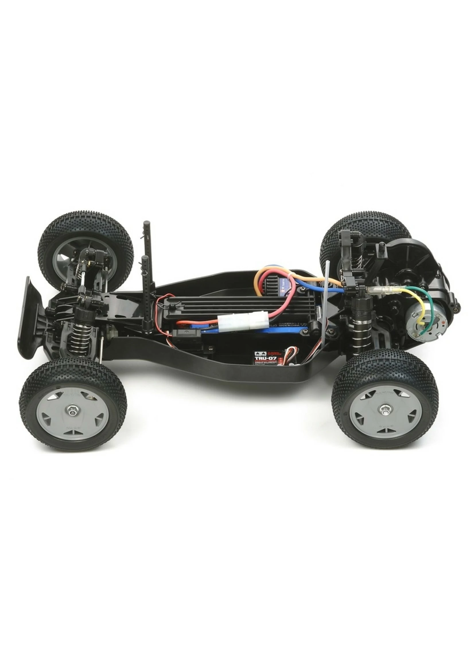 The DT-02 chassis bathtub type frame chassis features a longitudinal battery layout for lower center of gravity and optimum weight distribution. 4-wheel double wishbone suspension is equipped with CVA oil damper units to provide superb off-road traction. A sealed gearbox protects against dust and debris and is equipped with differential gears to ensure smooth cornering. Star-dish wheels are paired with dual block K tires front and rear to ensure that the model offers a dynamic drive.
