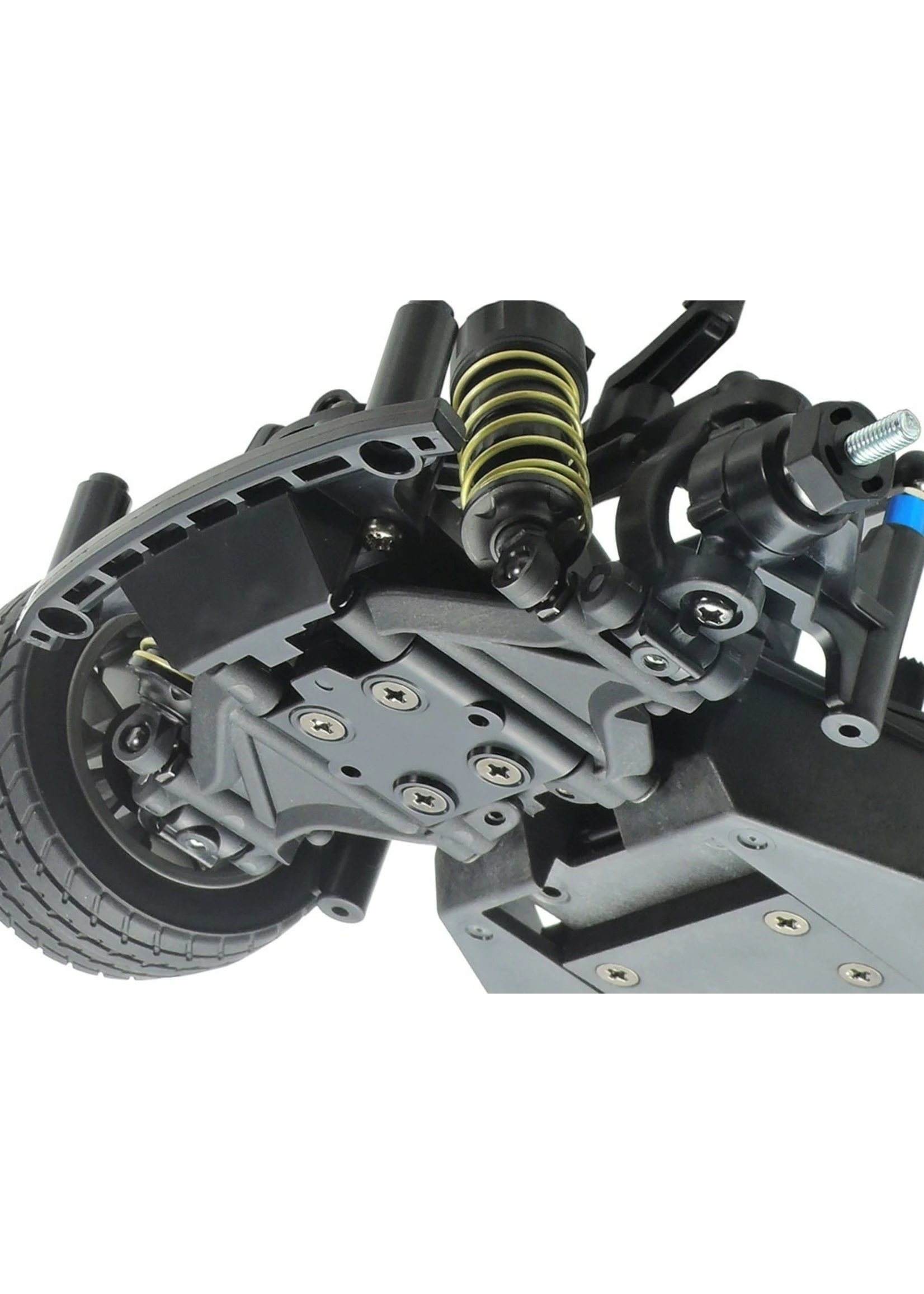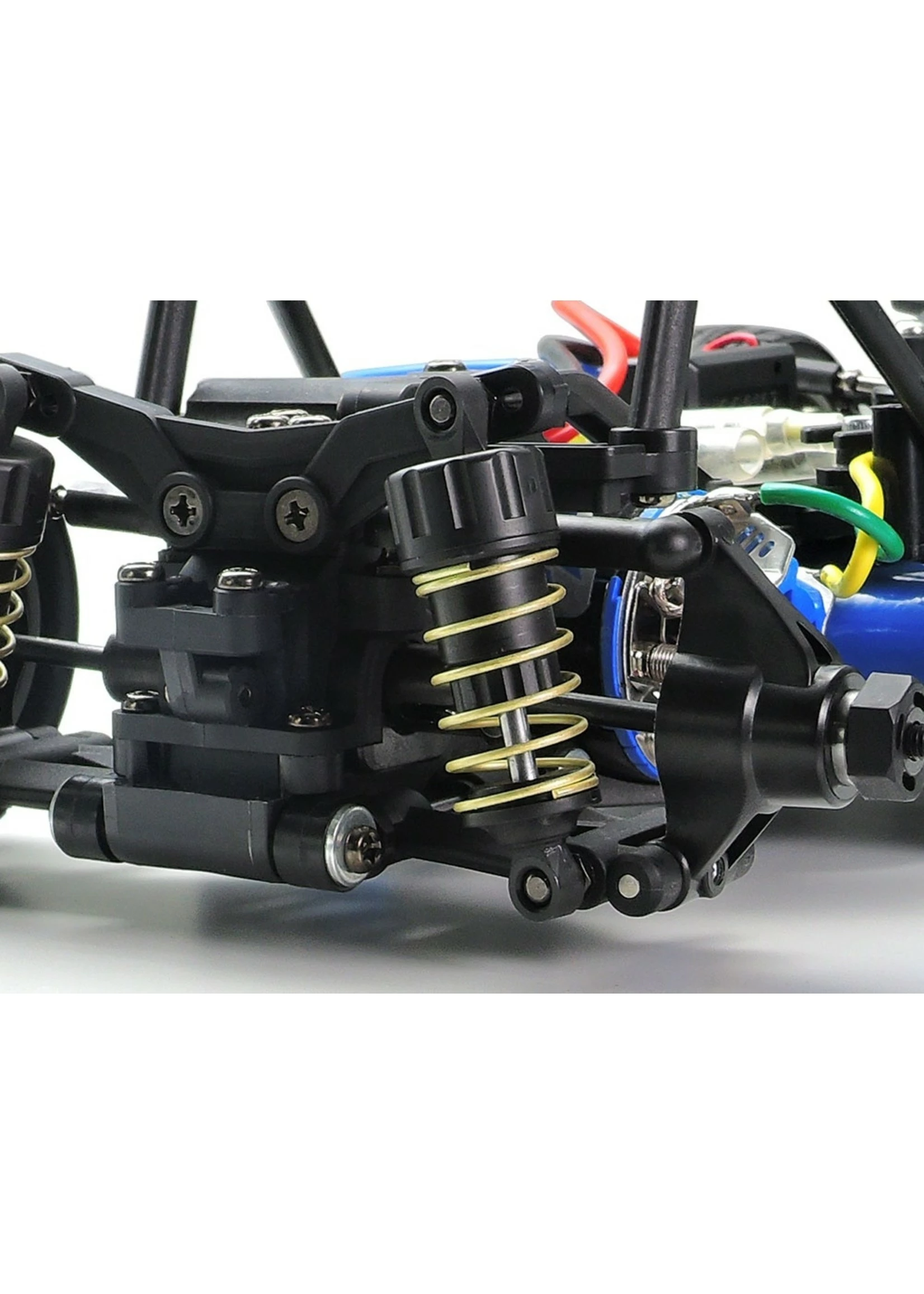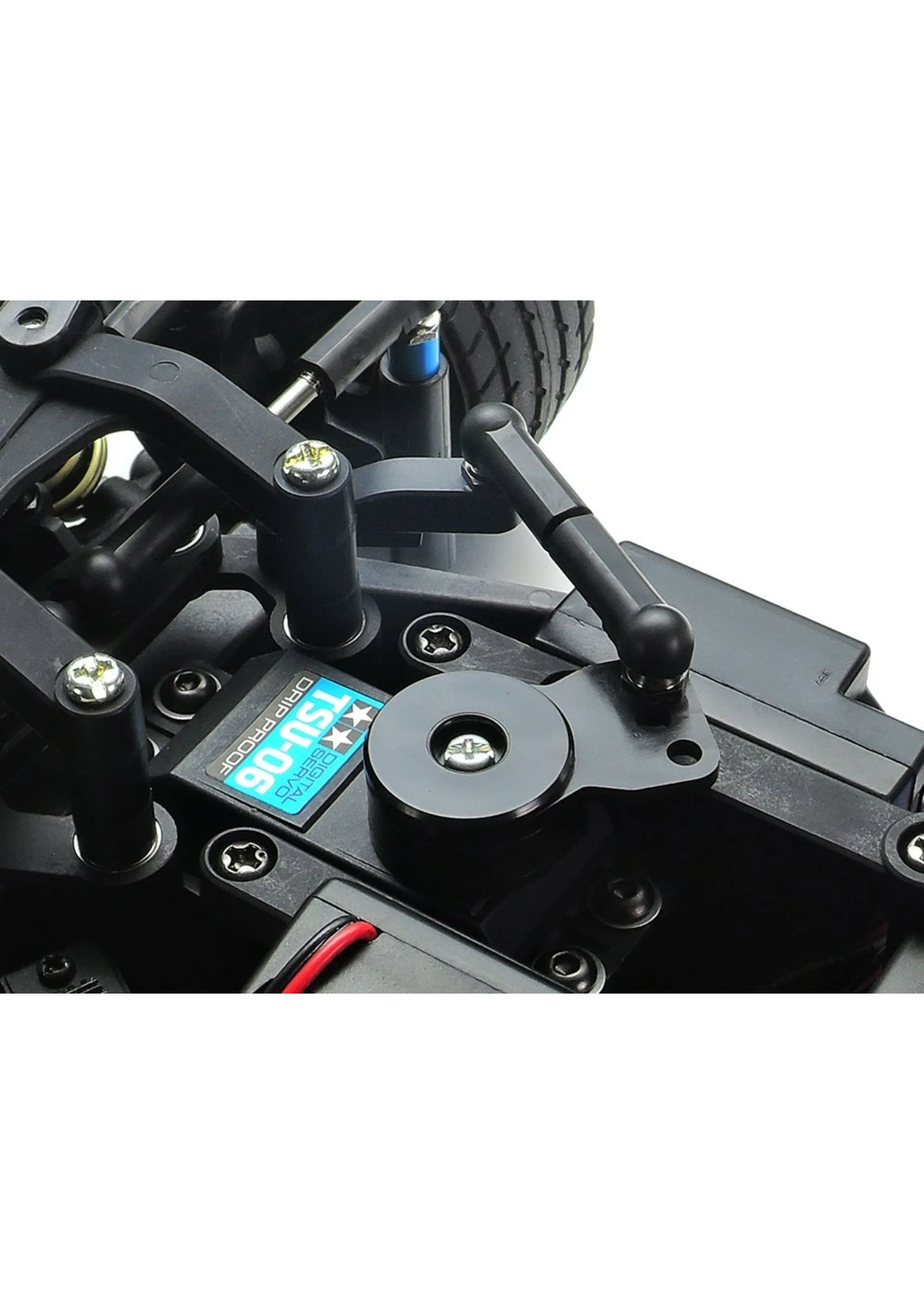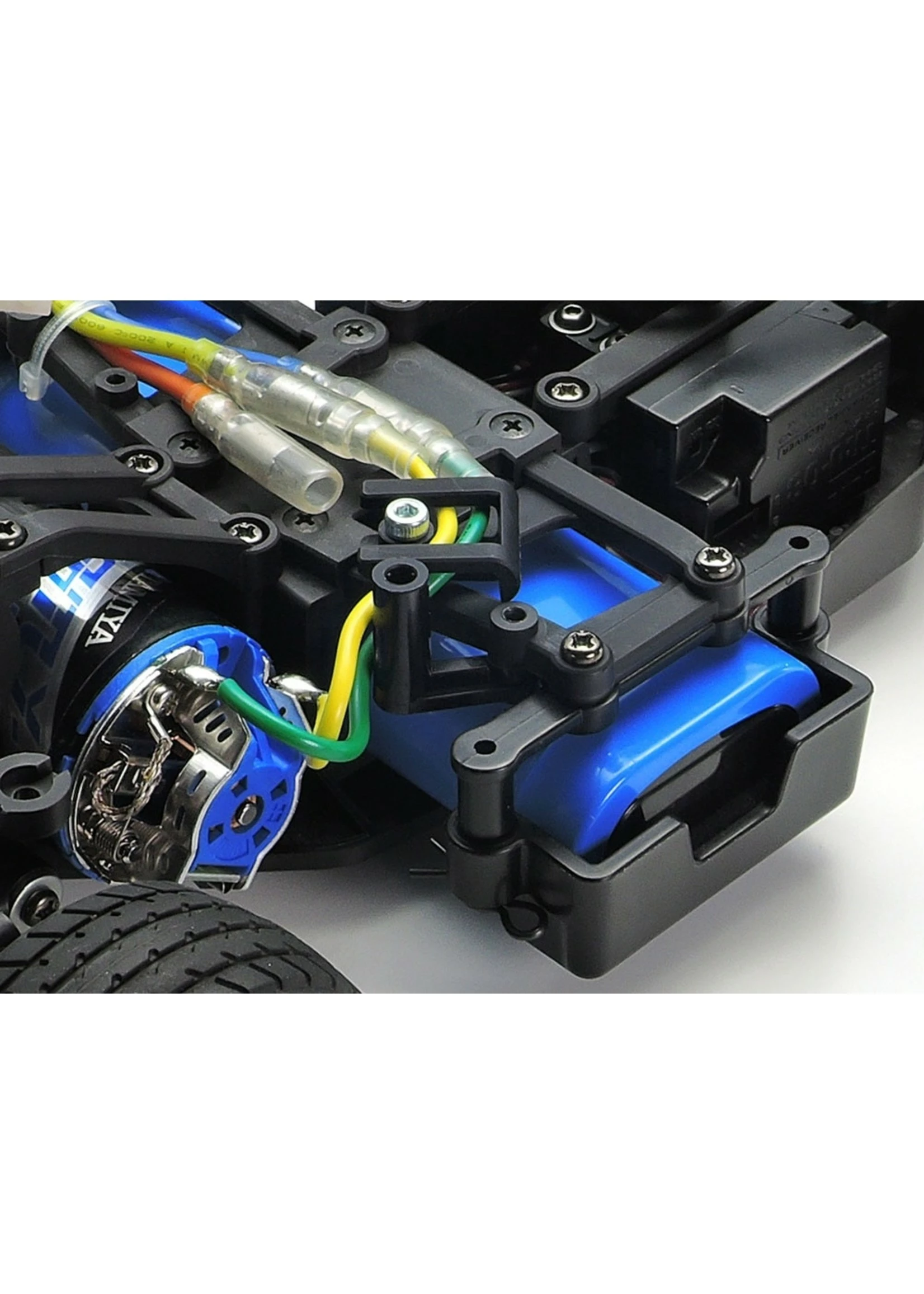 This TAMIYA high-performance rear-wheel drive R/C chassis assembly kit is constructed around a rigid monocoque with the main frame split into front and rear sections. It offers superior rear high traction drive characteristics and fuss-free maintenance of parts such as the easy-access differential. C.V.A. (Constant Volume Adjustable) oil shock-damped 4-wheel double wishbone suspension features dedicated long arms and steering linkage components for a range of setup options. A silky-smooth drivetrain utilizes full ball bearings, oil-filled gear differential unit and universal drive shafts. It can be assembled with a 210mm (S), 225mm (M) or 239mm (L) wheelbase, making it compatible with appropriately-sized existing Tamiya M-chassis body parts sets.