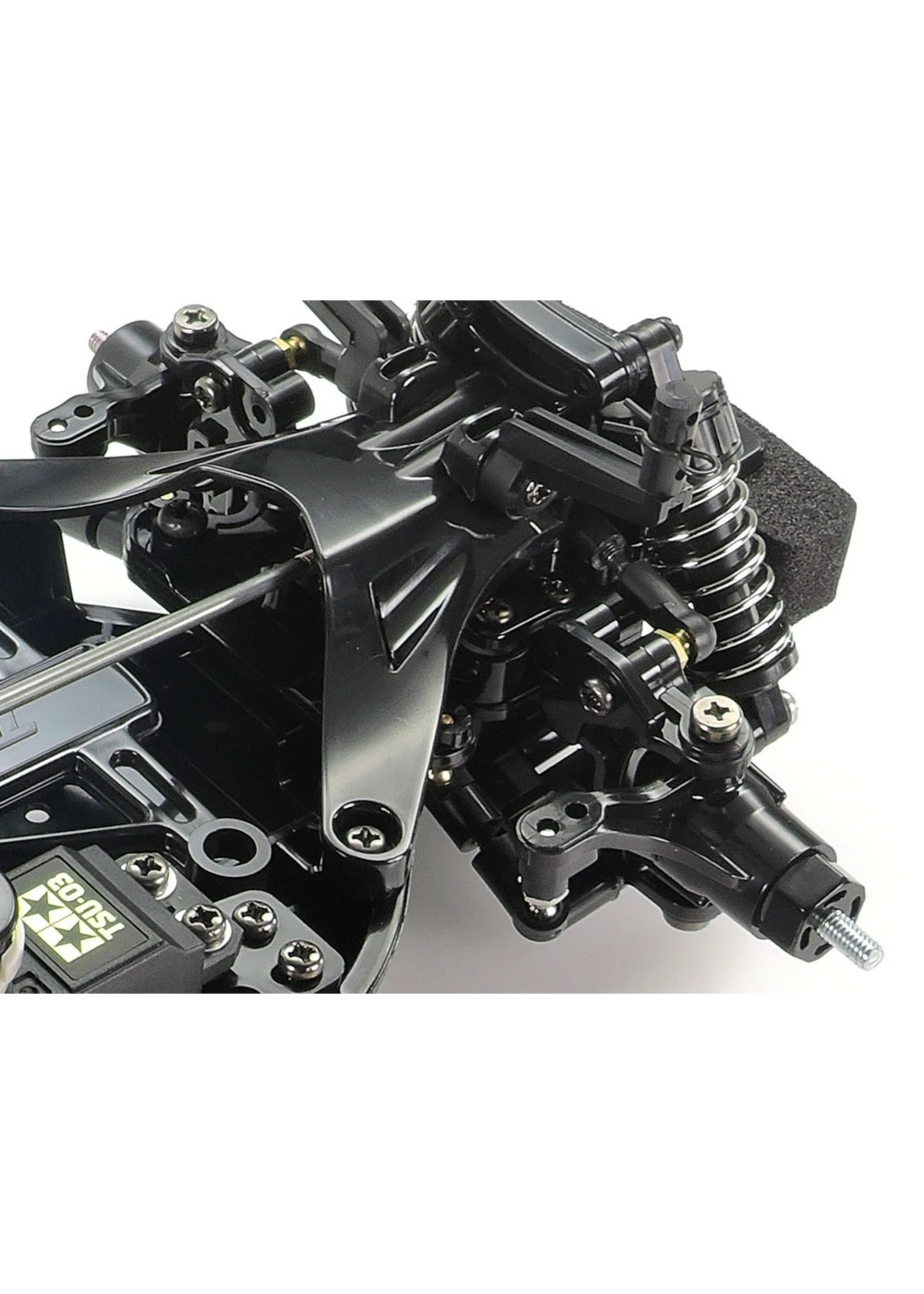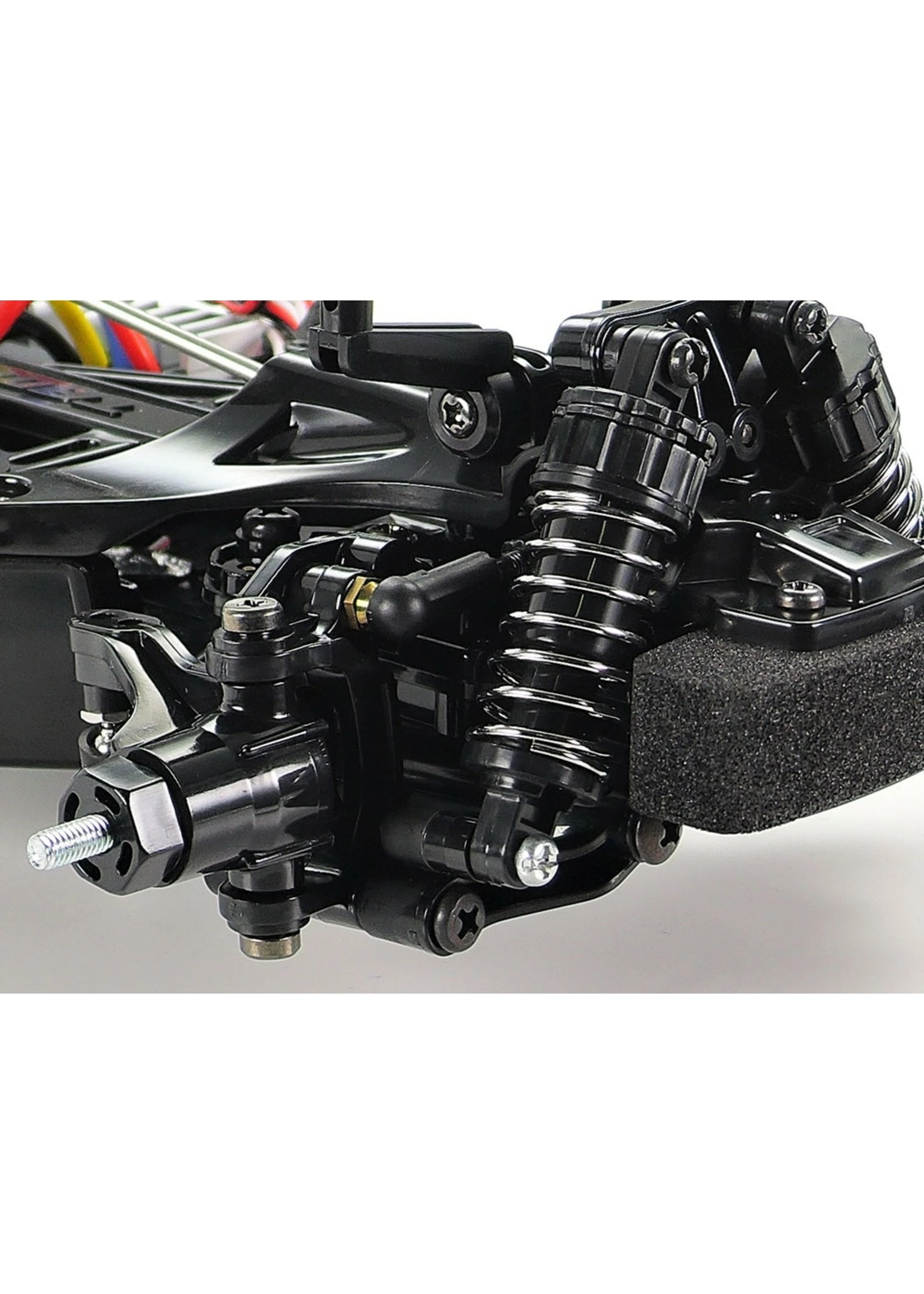 The M-06 chassis features a rear-mounted motor, rear-drive setup and has a longitudinally-mounted battery pack, with R/C equipment positioned on either side for optimum balance and a low center of gravity. 4-wheel double wishbone suspension uses dish design wheels, equipped with 60D radial tires at the front and 60D super radial (hard) tires at the rear. In addition, a 3-piece steering linkage offers nimble handling response.
