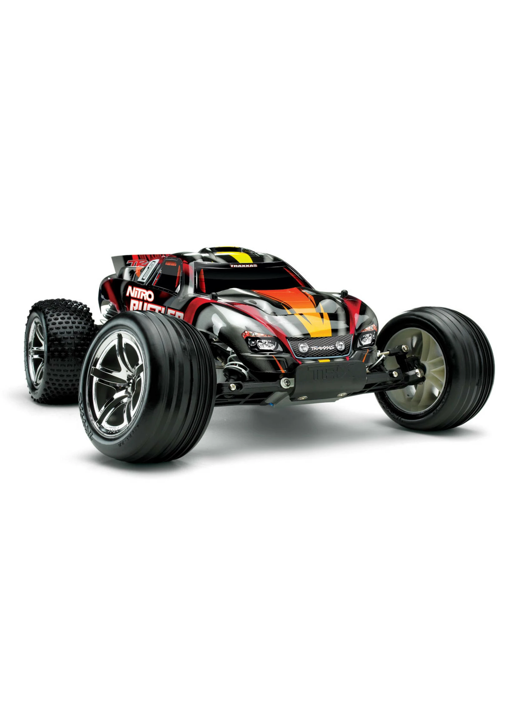 The Nitro Rustler is the first name in high performance 2WD nitro stadium trucks. Powered by the proven performance of the TRX 2.5 Racing Engine, Nitro Rustler totally out-muscles the competition with top speeds beyond 50 mph! The TRX 2.5 also pumps out the torque for brutal, wheel-standing launches and absolutely ruthless acceleration. The sleek body design cheats the wind with its smooth curves and low-slung stance, while the outrageous graphics dominate with style. The separate wing securely bolts to the body with precise aluminum hex hardware. Chrome 2.8 Twin Spokeâ„¢ rims are wrapped with pre-glued Aliasâ„¢ step-pin tires in the rear and Aliasâ„¢ ribbed tires up front. The high-tech rubber compound ensures great grip on a variety of surfaces. Grey-molded composite parts are thoughtfully integrated to enhance the look of the chassis. Fast, light, and loaded with power, Nitro Rustler’s power-sliding, dirt roosting attitude will have you reaching for the throttle again and again.