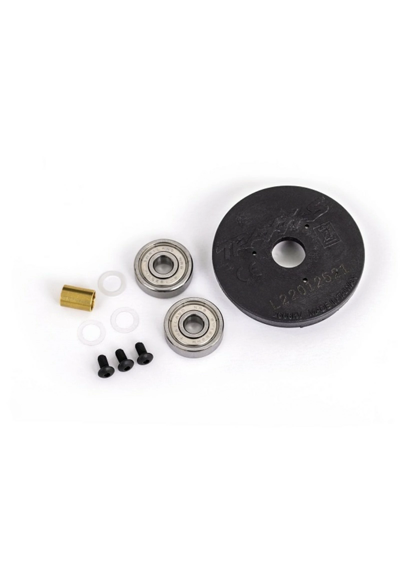 Plastic endbell, 5x16x5 mm bearings (2), 5×7.5x.05 mm washer, 5×7.5x.1 mm washer, 5×7.5x.19 mm washer, 6x5x8.5 mm spacer and button-head machine screws with threadlock (3).