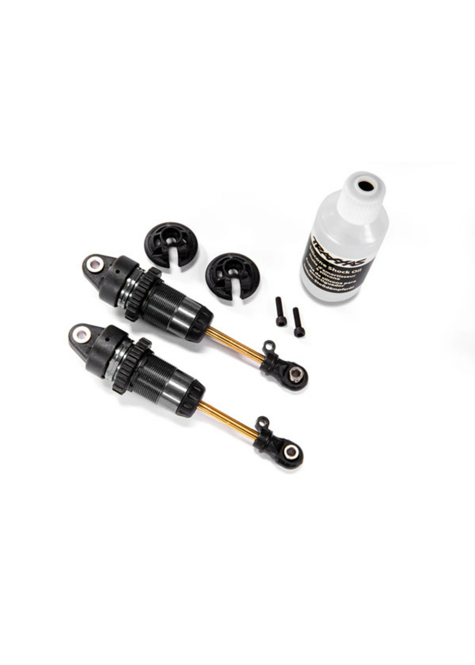 Traxxas 1/10 scale GTR shocks represent the peak of suspension technology. The brilliantly-anodized PTFE-coated aluminum shock bodies have 13 mm bores to hold over 70% more oil than the standard Ultra Shocks and their slick titanium-nitride coated shafts resist scuffing, increase durability, and eliminate “stiction.” X-rings keep oil in and dirt out for smooth, consistent damping, and plush suspension action. Spring preload and ride height changes are as simple as turning the threaded spring collars. The lower spring retainers even feature a locking screw to prevent annoying pop-off in the middle of your run. Includes 30-weight pure silicone shock oil. (Springs sold separately)