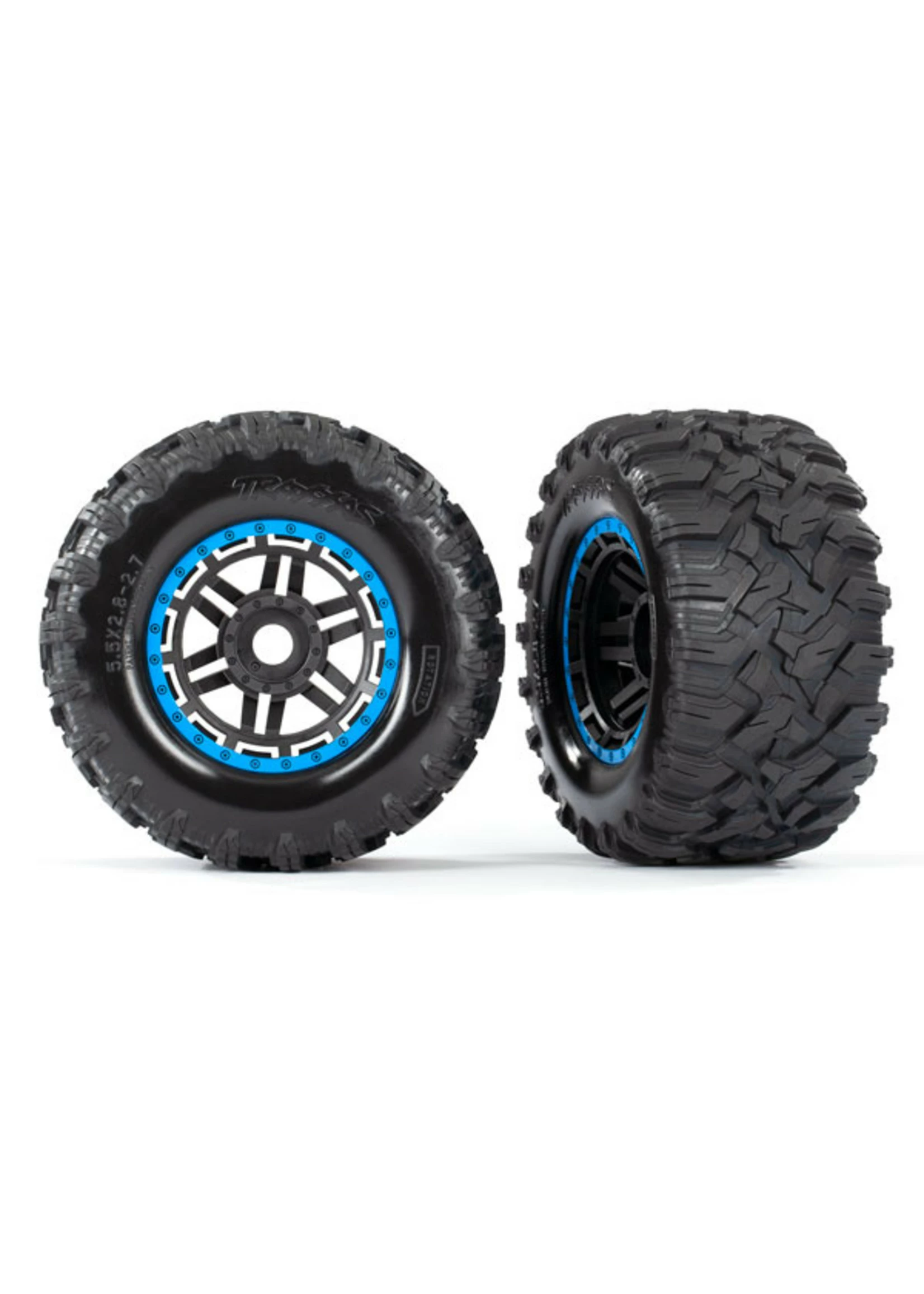 Includes: Tires & wheels, assembled, glued (black, blue beadlock style wheels, Maxx® MT tires, foam inserts) (2) (17mm splined) (TSM® rated)