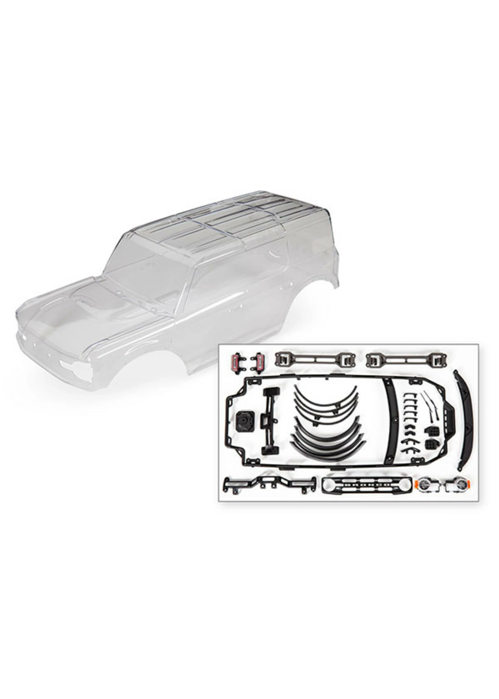 Includes: Body, Ford Bronco (2021) (clear, requires painting)/ decals/ window masks (includes grille, side mirrors, door handles, fender flares, windshield wipers, spare tire mount, clipless mounting, hardware) (requires #8080X inner fenders)