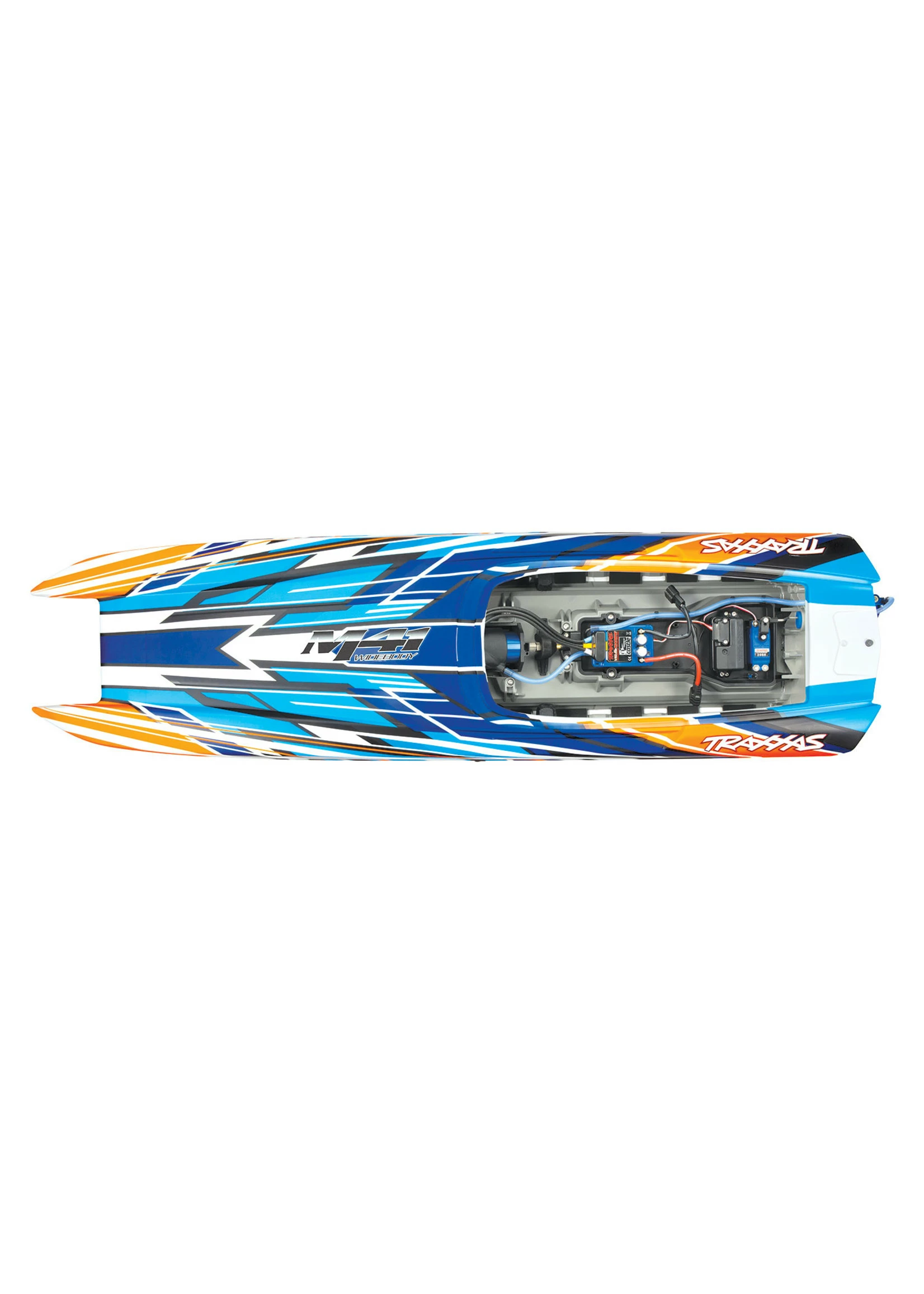 The DCB M41 Widebody catamaran, designed by DCB (Dave’s Custom Boats) founder Dave Hemmingson, is one of the largest models offered in the DCB M-Series. With its precision sculpted design and a pair of Mercury Racing 1350 engines, it speeds across the water at 175mph! Traxxas faithfully captured the incredible looks and performance of the DCB M41 in a detailed scale replica that is versatile, fun, and fast. The catamaran hull delivers the speed, stability and confidence for which the full-size M41 is famous, allowing you to have fun wherever your marine adventures take you. The M41 replica is equally at home blasting across the waves at the lake on a fun run or exploiting its 50+mph speed on a favorite stretch of smooth water. The razor sharp handling lets you carve turns with authority and precision and yet, offers easy control while cruising by the shore.