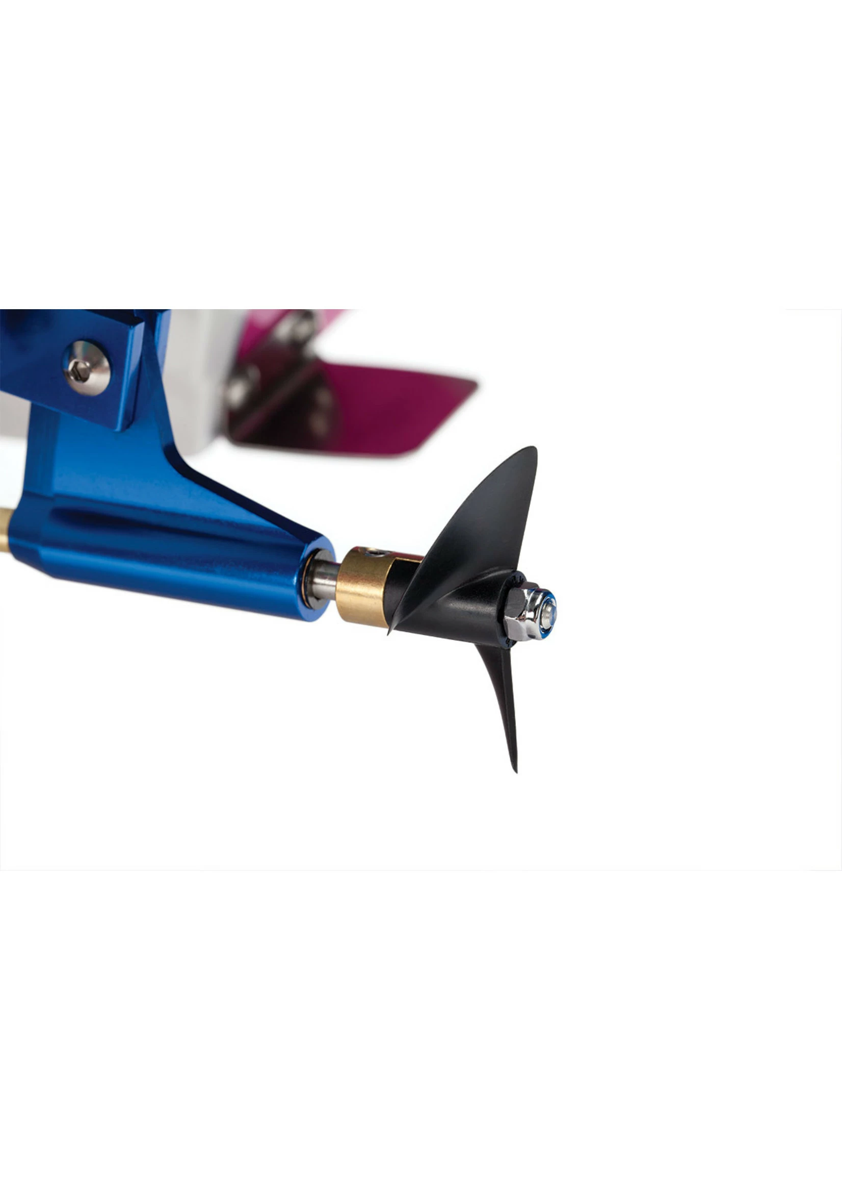 - Blue-anodized aluminum rudder support, rudder, and drive strut