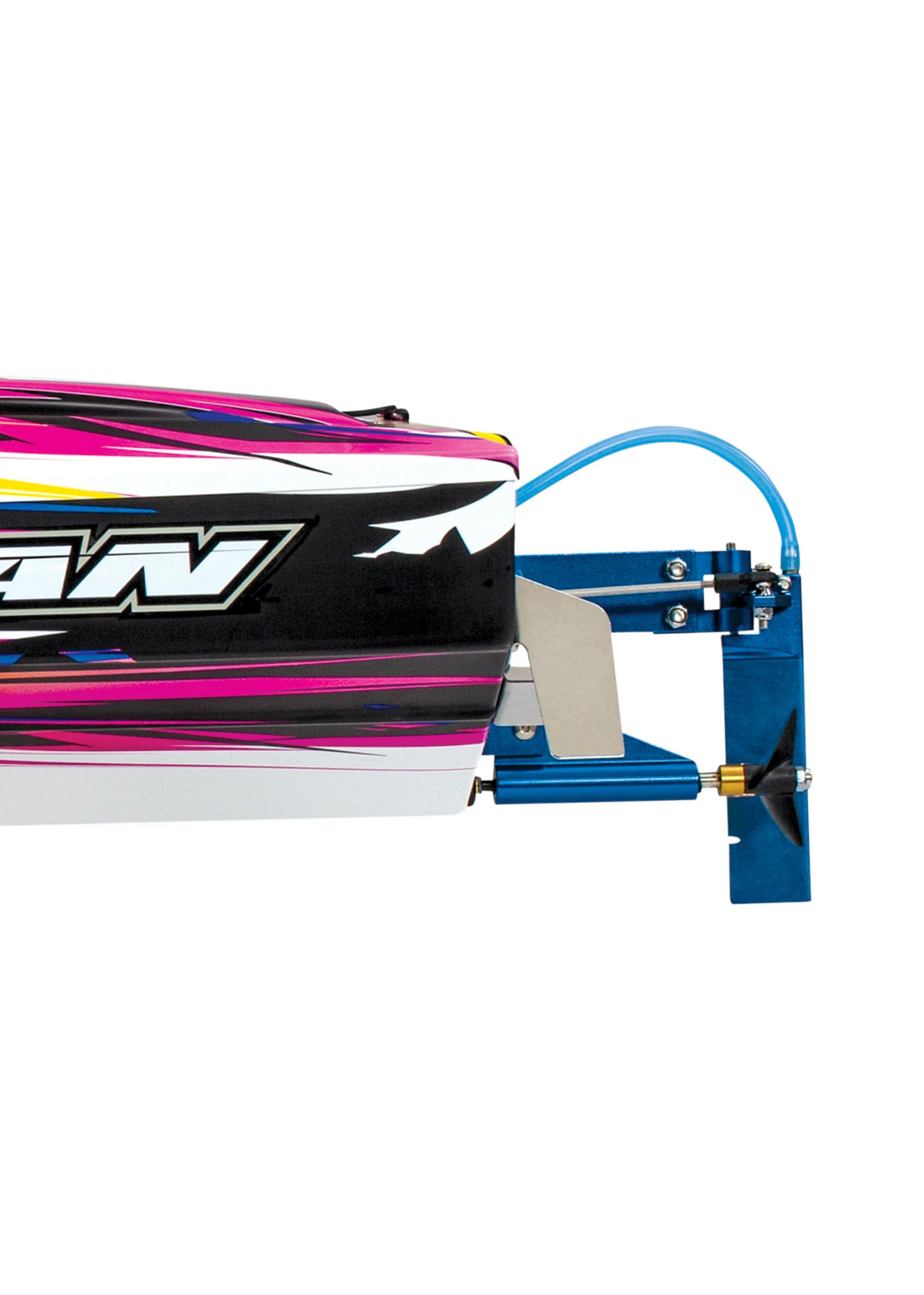 The Spartan’s clean, modern hull design is built up in layers for maximum rigidity where it matters most, the transom and ride pad. Lightweight yet incredibly strong, Spartan’s ABS hull is designed to withstand the stress of high-voltage brushless horsepower, without the weight penalty of a fiberglass hull. The transom bulkhead also incorporates bosses for the trim tabs, turn fins, rudder support, and drive strut, eliminating the need for additional hardware inside the hull. In the Spartan’s bow, molded foam is form-fitted to the interior, adding security as it further stiffens the hull. Outside the hull, Spartan impresses with its wild factory-applied graphics—a Traxxas trademark.