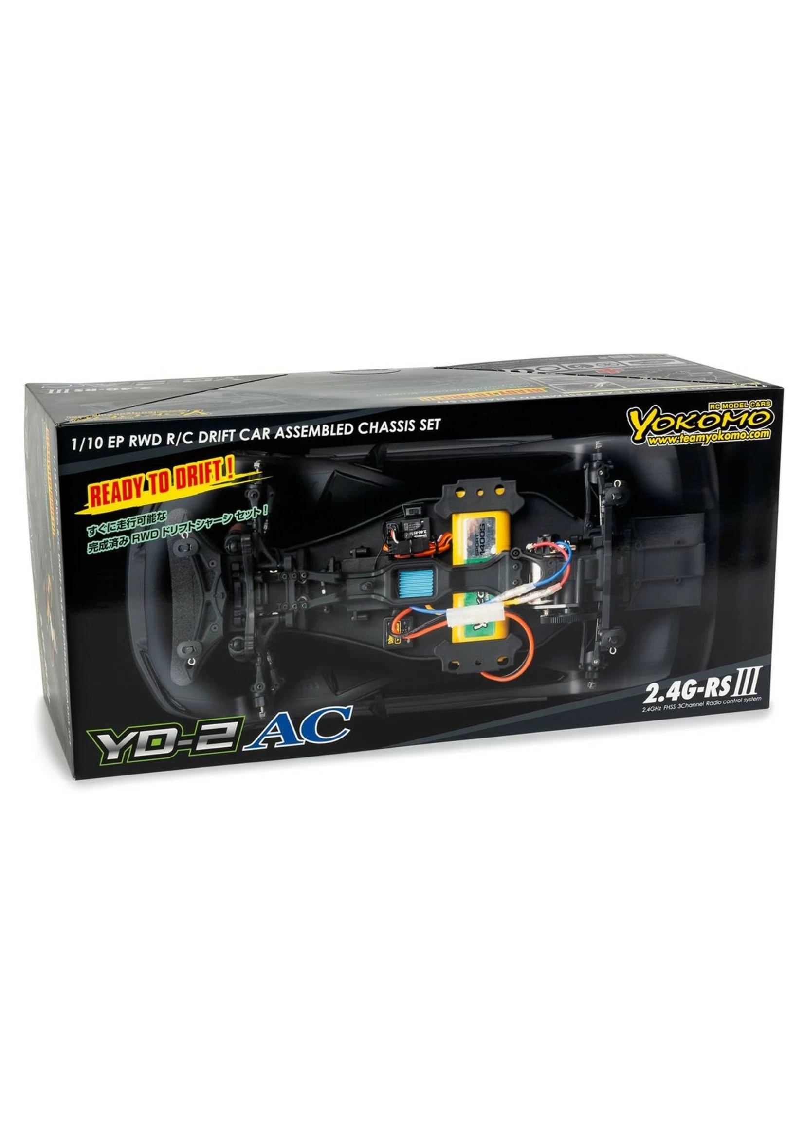 Yokomo YD-2AC “Ready To Drift” 1/10 2WD RWD Drift Car Kit is a 90% pre-built chassis. This kit includes the Yokomo SCR-BR speed control, 27 turn drift zero brushed motor, YG-302 gyro, 800-S servo, RSIII 2.4GHz transmitter and a 1400mAh NiCd battery with wall charger. You add the body, wheels and tires you prefer to complete the kit!